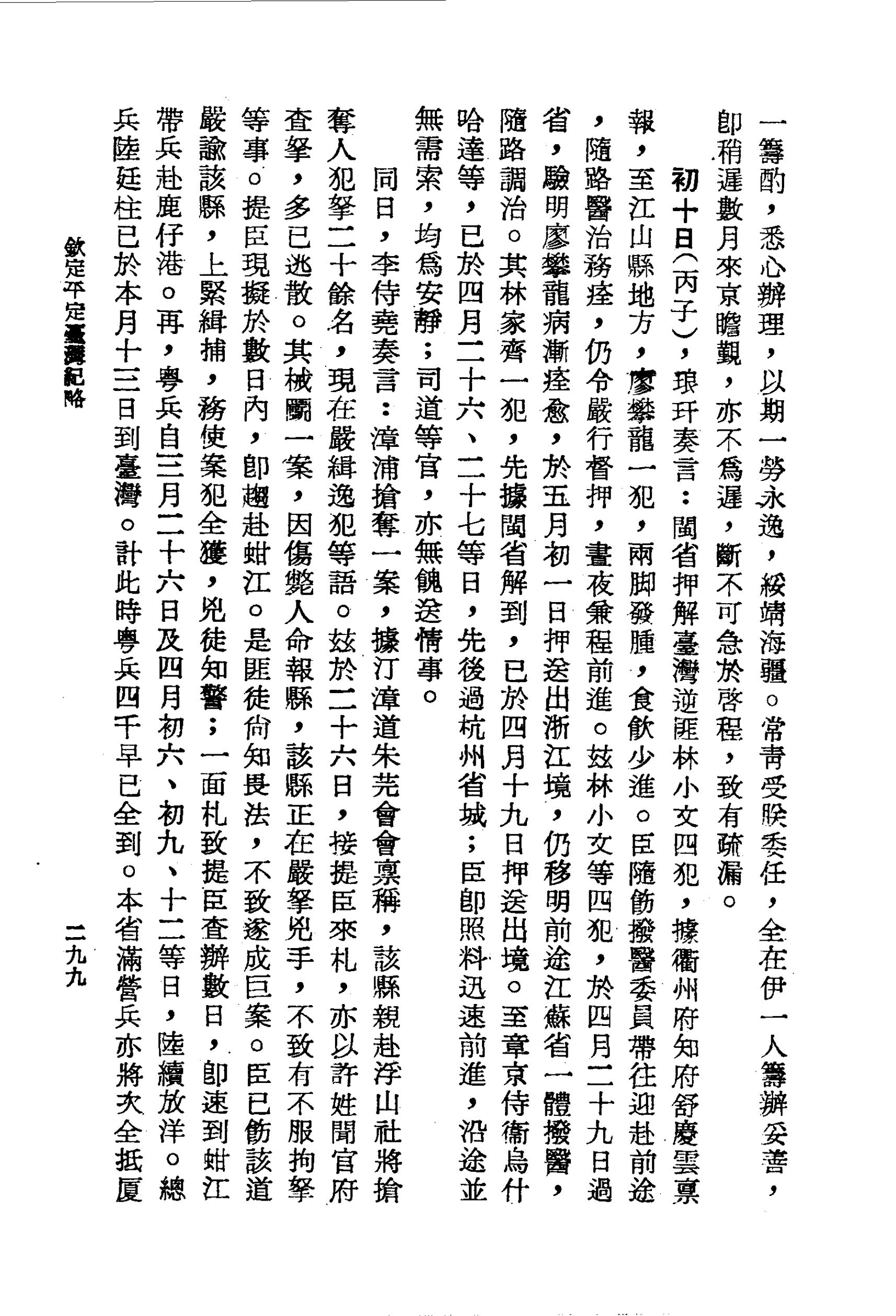 初十日(丙子),琅玕奏言:閩省押解臺灣逆匪林小文四犯,據衢州府知府舒慶雲稟報,至江山縣地方,廖攀龍一犯,兩腳發腫,食飲少進。臣隨飭撥醫委員帶往迎赴前途,隨路醫治務痊,仍令嚴行督押,晝夜兼程前進。茲林小文等四犯,於四月二十九日過省,驗明廖攀龍病漸痊愈,於五月初一日押送出浙江境,仍移明前途江蘇省一體撥醫,隨路調治。其林家齊一犯,先據閩省解到,已於四月十九日押送出境。至章京侍衛烏什哈達等,已於四月二十六、二十七等日,先後過杭州省城;臣即照料迅速前進,沿途並無需索,均為安靜;司道等官,亦無餽送情事。