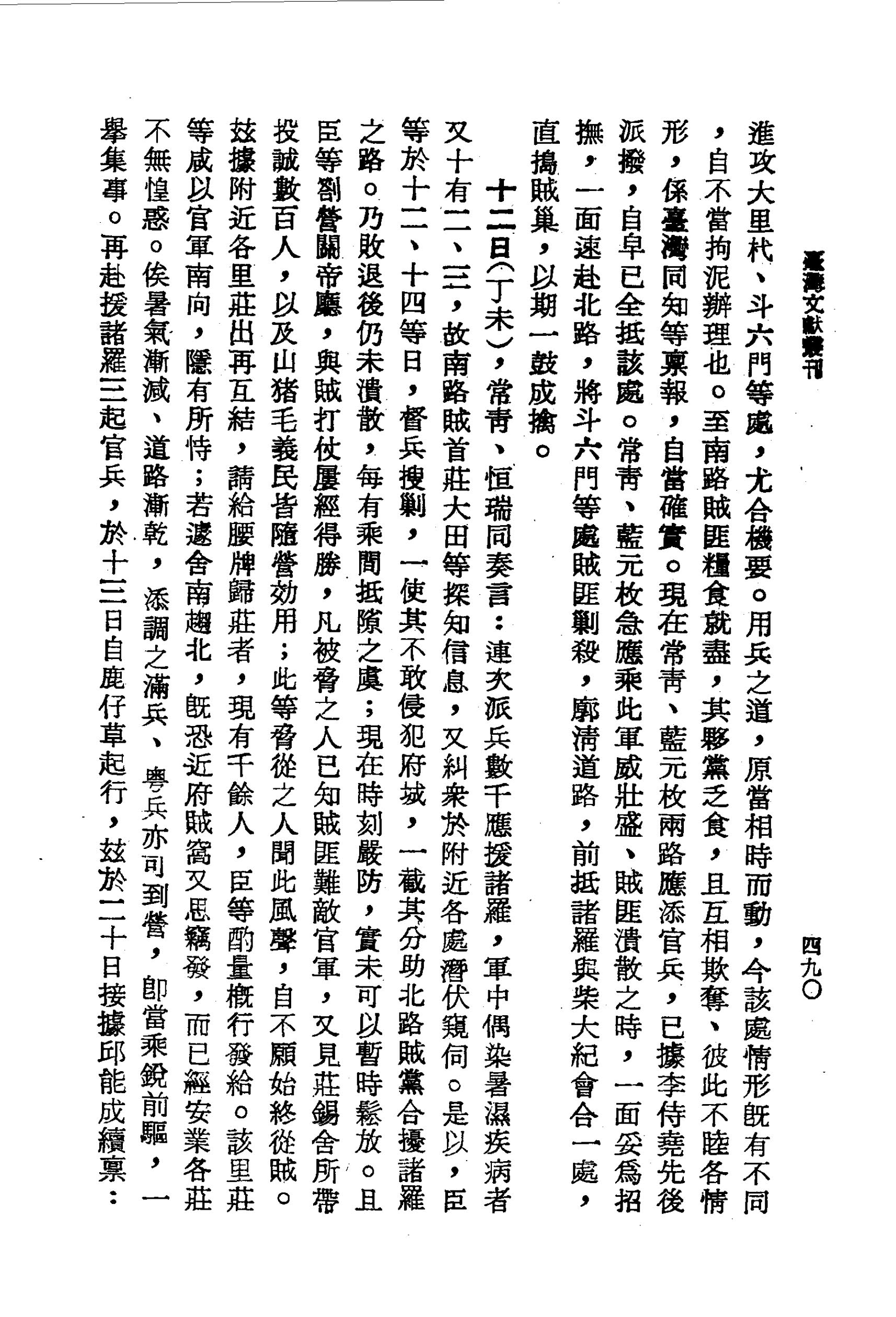十二日(丁未),常青、恒瑞同奏言:連次派兵數千應援諸羅,軍中偶染暑濕疾病者又十有二、三,故南路賊首莊大田等探知信息,又糾眾於附近各處潛伏窺伺。是以,臣等於十二、十四等日,督兵搜勦,一使其不敢侵犯府城,一截其分助北路賊黨合擾諸羅之路。乃敗退後仍未潰散,每有乘間抵隙之虞;現在時刻嚴防,實未可以暫時鬆放。