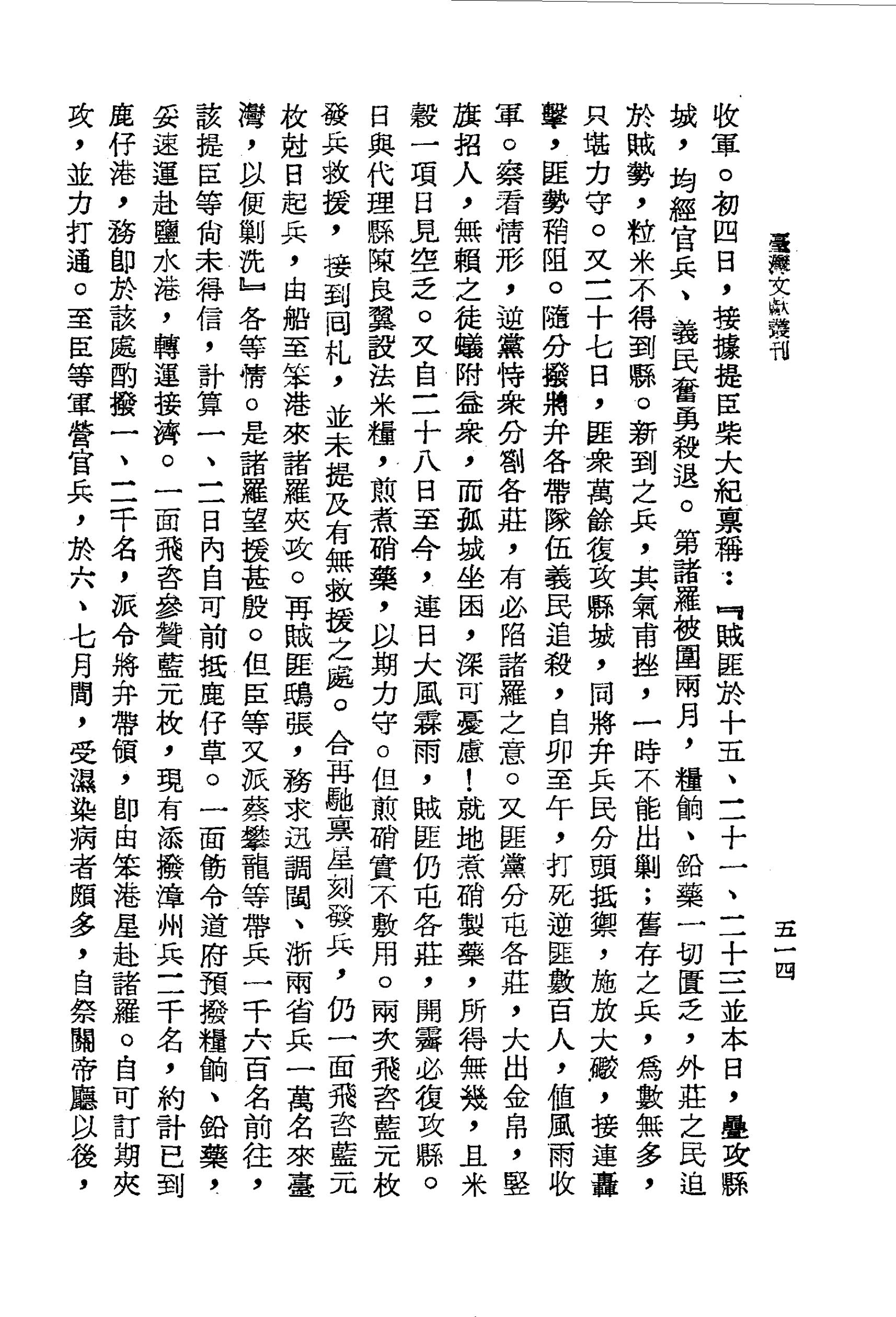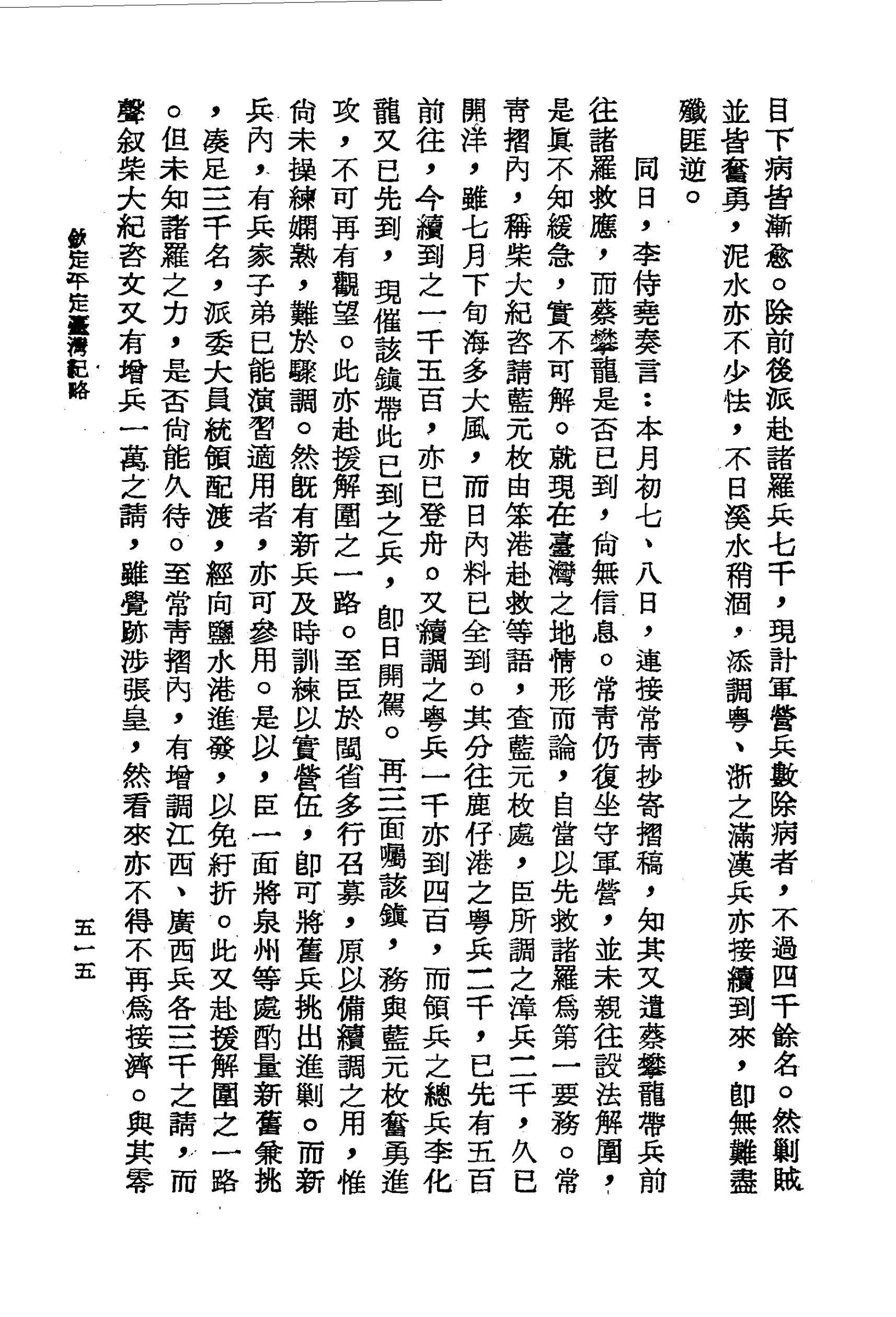 至臣等軍營官兵,於六、七月間,受濕染病者頗多,自祭關帝廳以後,目下病皆漸愈。除前後派赴諸羅兵七千,現計軍營兵數除病者,不過四千餘名。然勦賊並皆奮勇,泥水亦不少怯,不日溪水稍涸,添調粵、浙之滿漢兵亦接續到來,即無難盡殲匪逆。