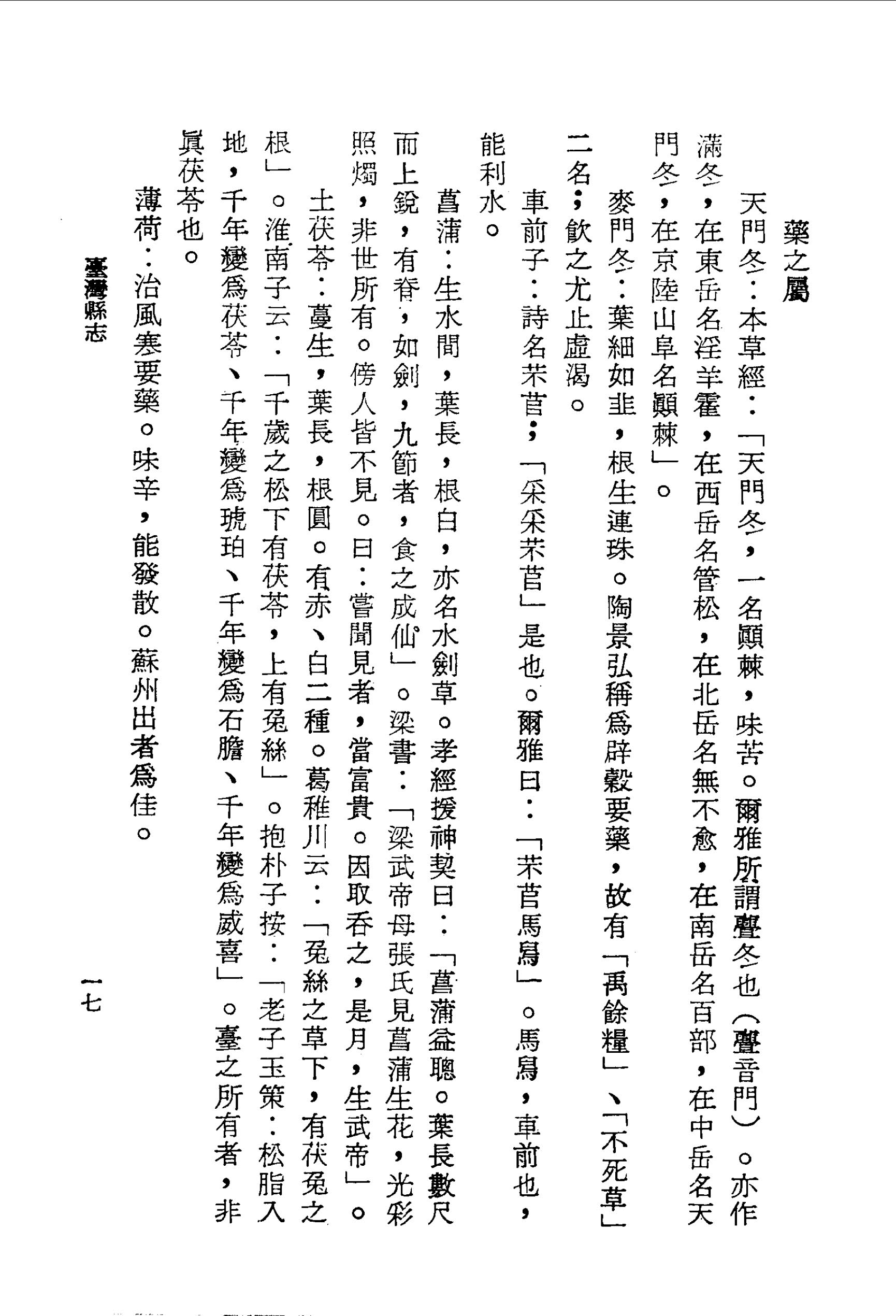 車前子:詩名芣苢;「采采芣苢」是也.爾雅曰:「芣苢馬舄」.馬舄,車前也,能利水。