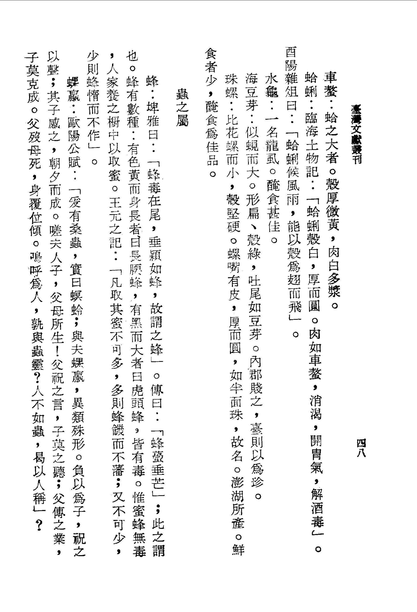 蛤蜊:臨海土物記:「蛤蜊殼白,厚而圓.肉如車螯,消渴,開胃氣,解酒毒」.酉陽雜俎曰:「蛤蜊候風雨,能以殼為翅而飛」.