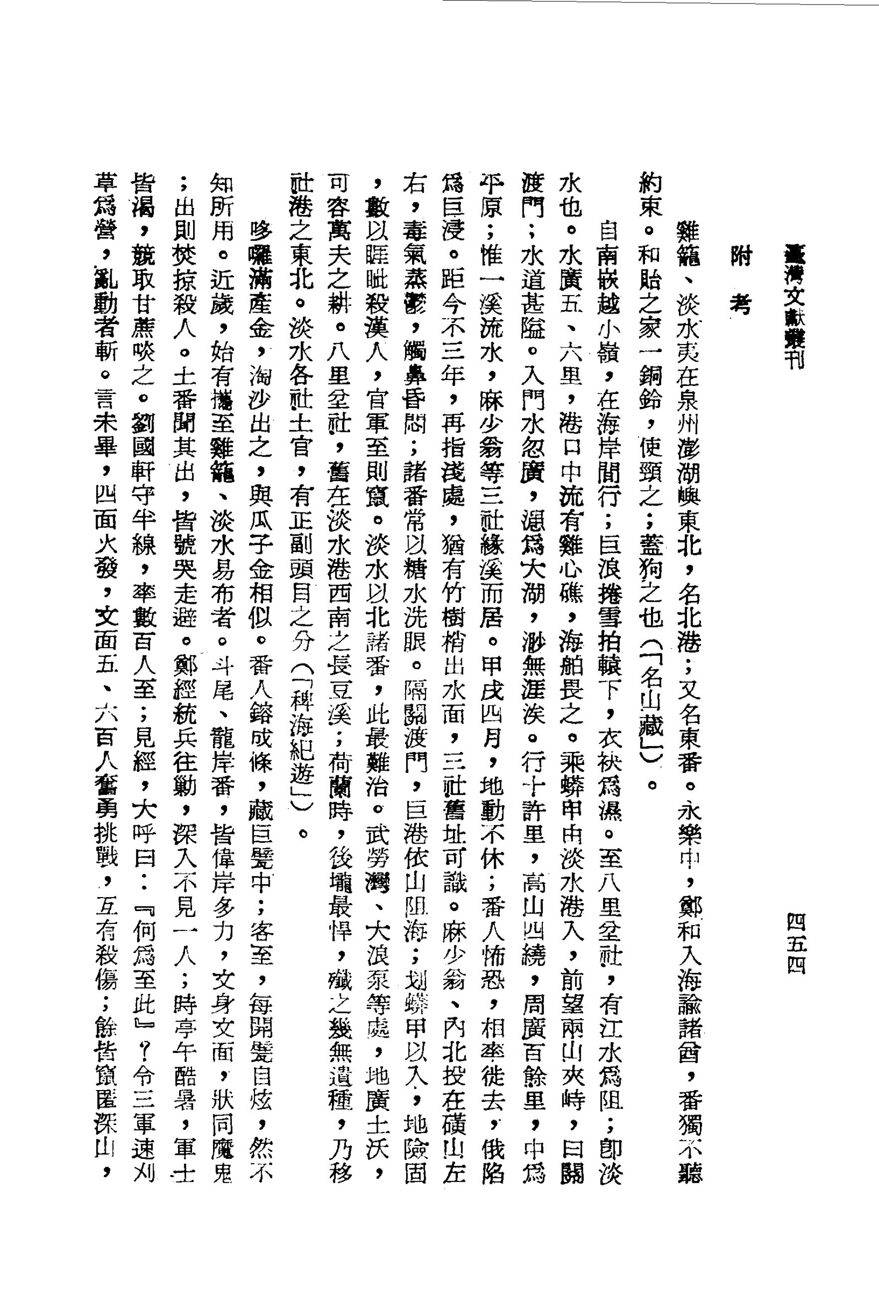 麻少翁、內北投在磺山左右,毒氣蒸鬱,觸鼻昏悶;諸番常以糖水洗眼。隔關渡門,巨港依山阻海;划蟒甲以入,地險固,數以睚眥殺漢人,官軍至則竄。淡水以北諸番,此最難治。