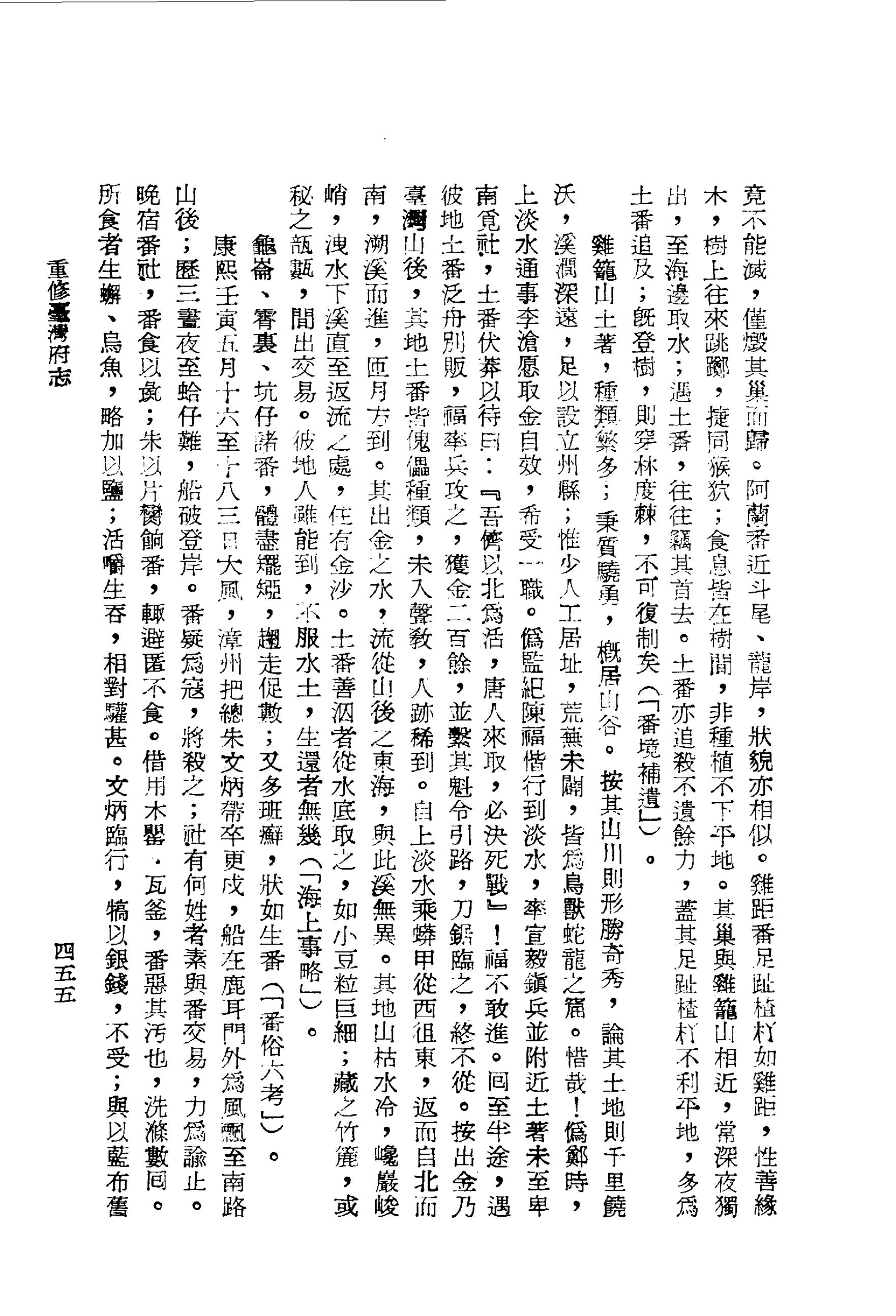 按出金乃臺灣山後,其地土番皆傀儡種類,未入聲教,人跡稀到。自上淡水乘蟒甲從西徂東,返而自北而南,溯溪而進,匝月方到。其出金之水,流從山後之東海,與此溪無異。其地山枯水冷,巉巖峻峭,洩水下溪直至返流之處,住有金沙。土番善泅者從水底取之,如小豆粒巨細;藏之竹簏,或秘之瓿甊,間出交易。彼地人雖能到,不服水土,生還者無幾(「海上事略」)。