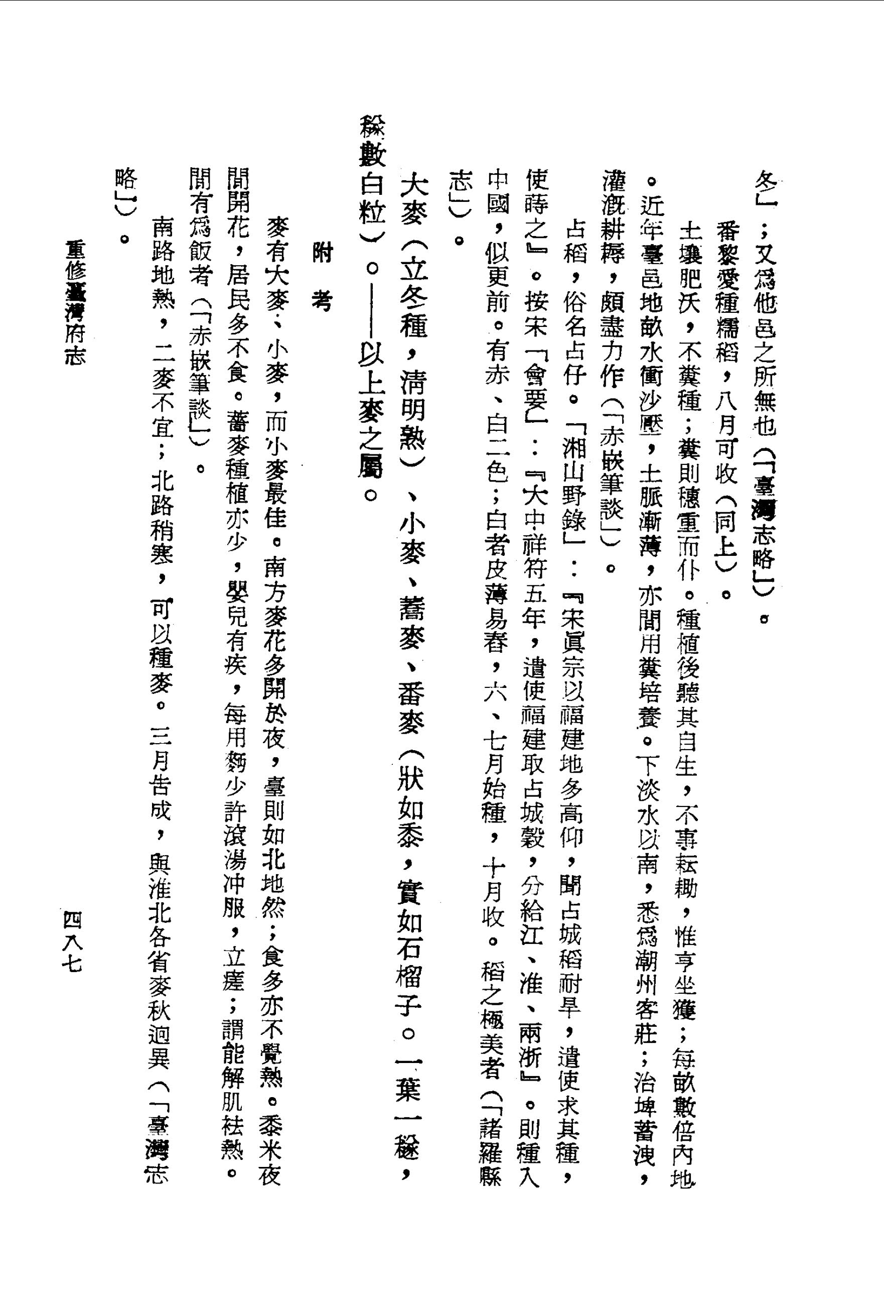麥有大麥、小麥,而小麥最佳。南方麥花多開於夜,臺則如北地然;食多亦不覺熱。黍米夜間開花,居民多不食。薔麥種植亦少,嬰兒有疾,每用麪少許滾湯沖服,立瘥;謂能解肌袪熱。間有為飯者(「赤嵌筆談」)。