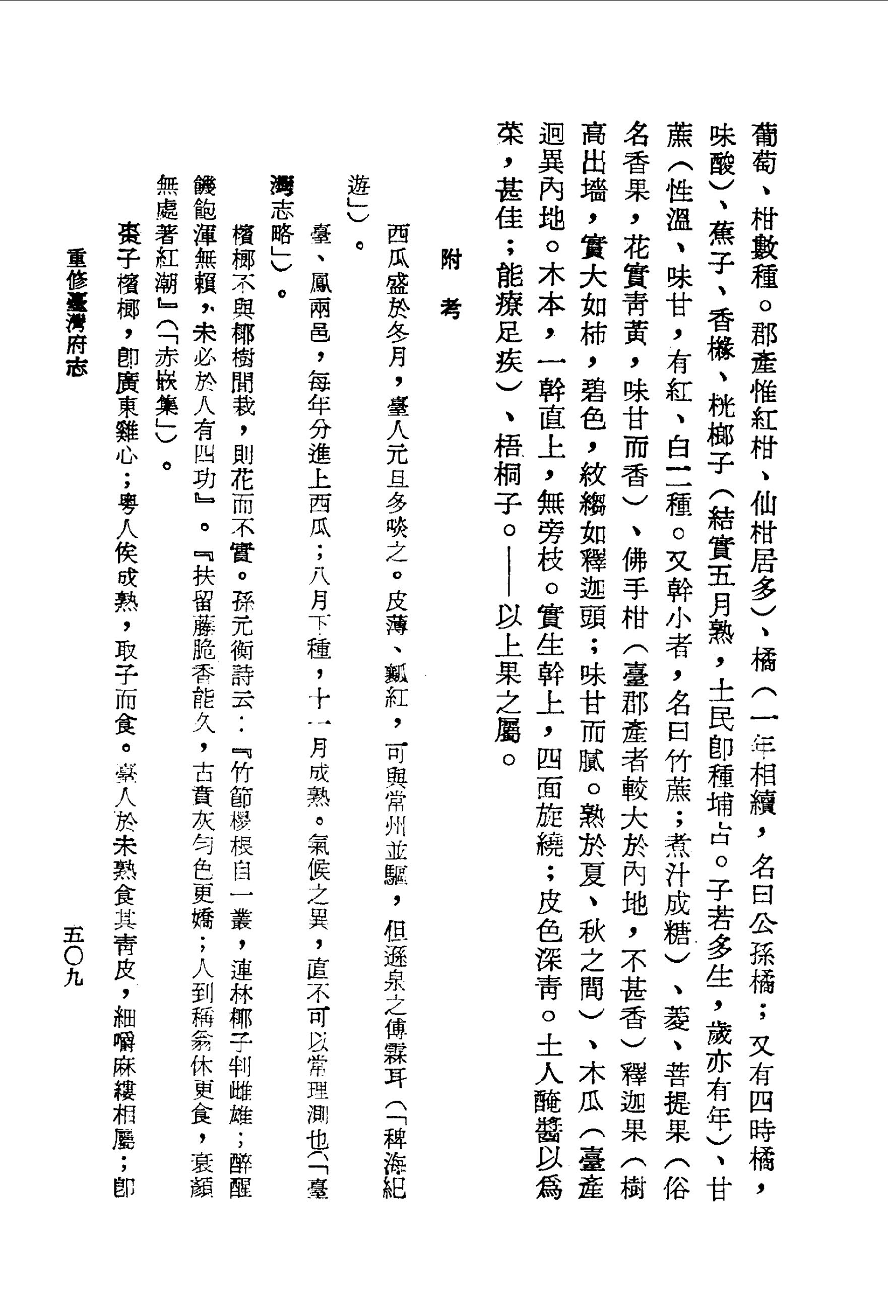 木瓜(臺產迥異內地.木本,一幹直上,無旁枝.實生幹上,四面旋繞;皮色深青.土人醃醬以為菜,甚佳;能療足疾)