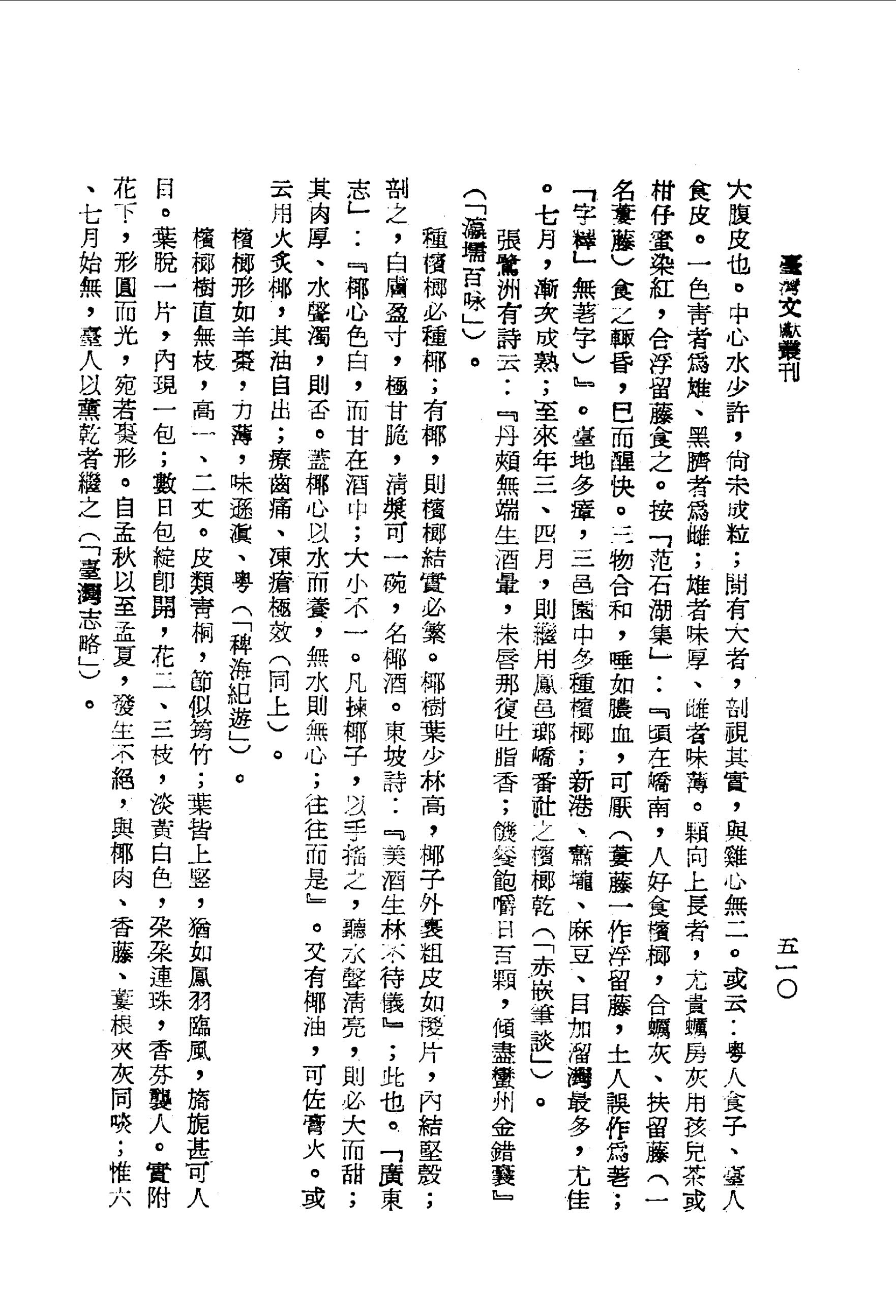 種檳榔必種椰;有椰,則檳榔結實必繁。椰樹葉少林高,椰子外裹粗皮如椶片,內結堅殼;剖之,白膚盈寸,極甘脆,清漿可一碗,名椰酒。東坡詩:『美酒生林不待儀』;此也。「廣東志」:『椰心色白,而甘在酒中;大小不一。凡揀椰子,以手搖之,聽水聲清亮,則必大而甜;其肉厚、水聲濁,則否。蓋椰心以水而養,無水則無心;往往而是』。又有椰油,可佐膏火。或云用火炙椰,其油自出;療齒痛、凍瘡極效(同上)。