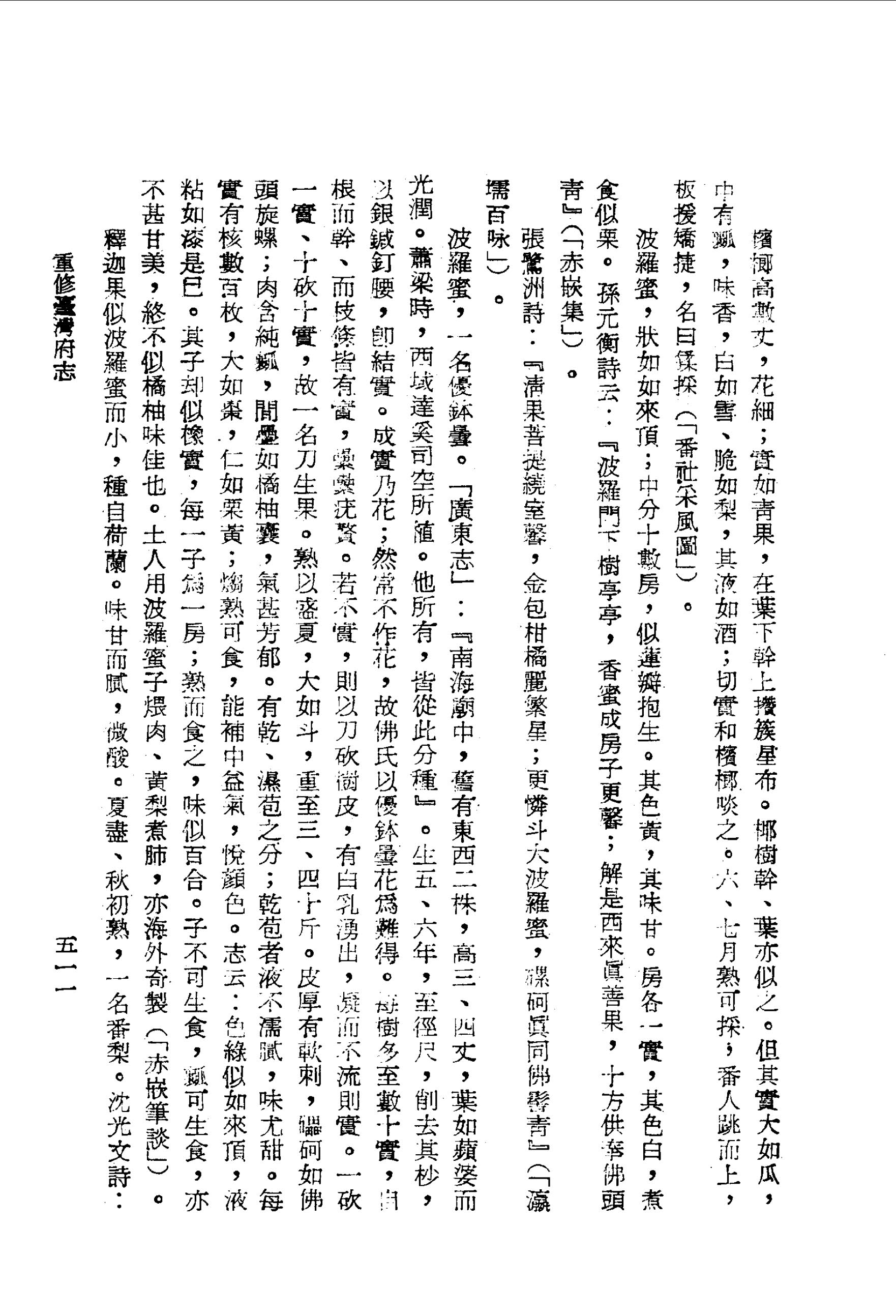 波羅蜜,一名優缽曇。「廣東志」:『南海廟中,舊有東西二株,高三、四尺,葉如蘋婆而光潤。蕭梁時,西域達奚司空所植。他所有,皆從此分種』。生五、六年,至徑尺,削去其杪,以銀鍼釘腰,即結實。成實乃花;然常不作花,故佛氏以優缽曇花為難得。每樹多至數十實,自根而幹、而枝條皆有實,纍纍疣贅。若不實,則以刀砍樹皮,有白乳湧出,凝而不流則實。一砍一實、十砍十實,故一名刀生果。熟以盛夏,大如斗,重至三、四十斤。皮厚有軟刺,礧砢如佛頭旋螺;肉含純瓤,間疊如橘柚囊,氣甚芳郁。有乾、濕苞之分;乾苞者液不濡膩,味尤甜。每嘟有核數百枚,大如棗,仁如栗黃;煼熟可食,能補中益氣,悅顏色。志云:色綠似如來頂,液粘如漆是巳。其子卻似橡實,每一子為一房;熟而食之,味似百合。子不可生食,瓤可生食,亦不甚甘美,終不似橘柚味佳也。土人用波羅蜜子煨肉、黃梨煮肺,亦海外奇製(「赤嵌筆談」)。