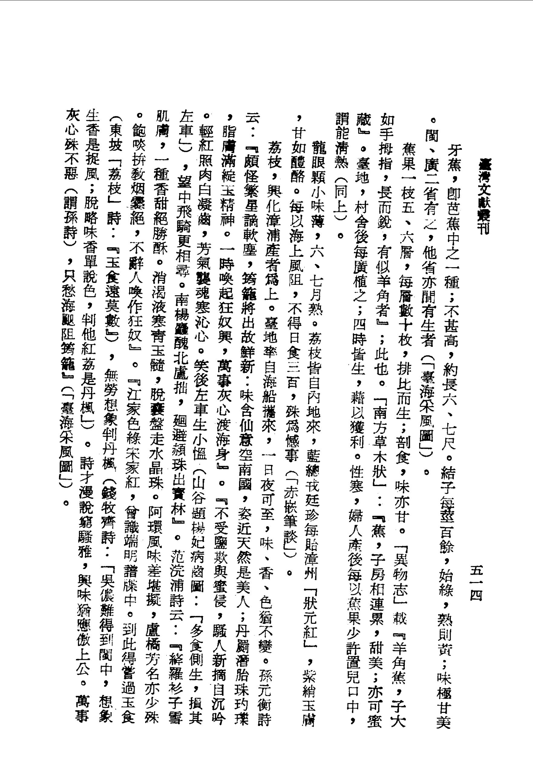 臺地,村舍後每廣植之;四時皆生,藉以獲利.性寒,婦人產後每以蕉果少許置兒口中,謂能清熱(同上).