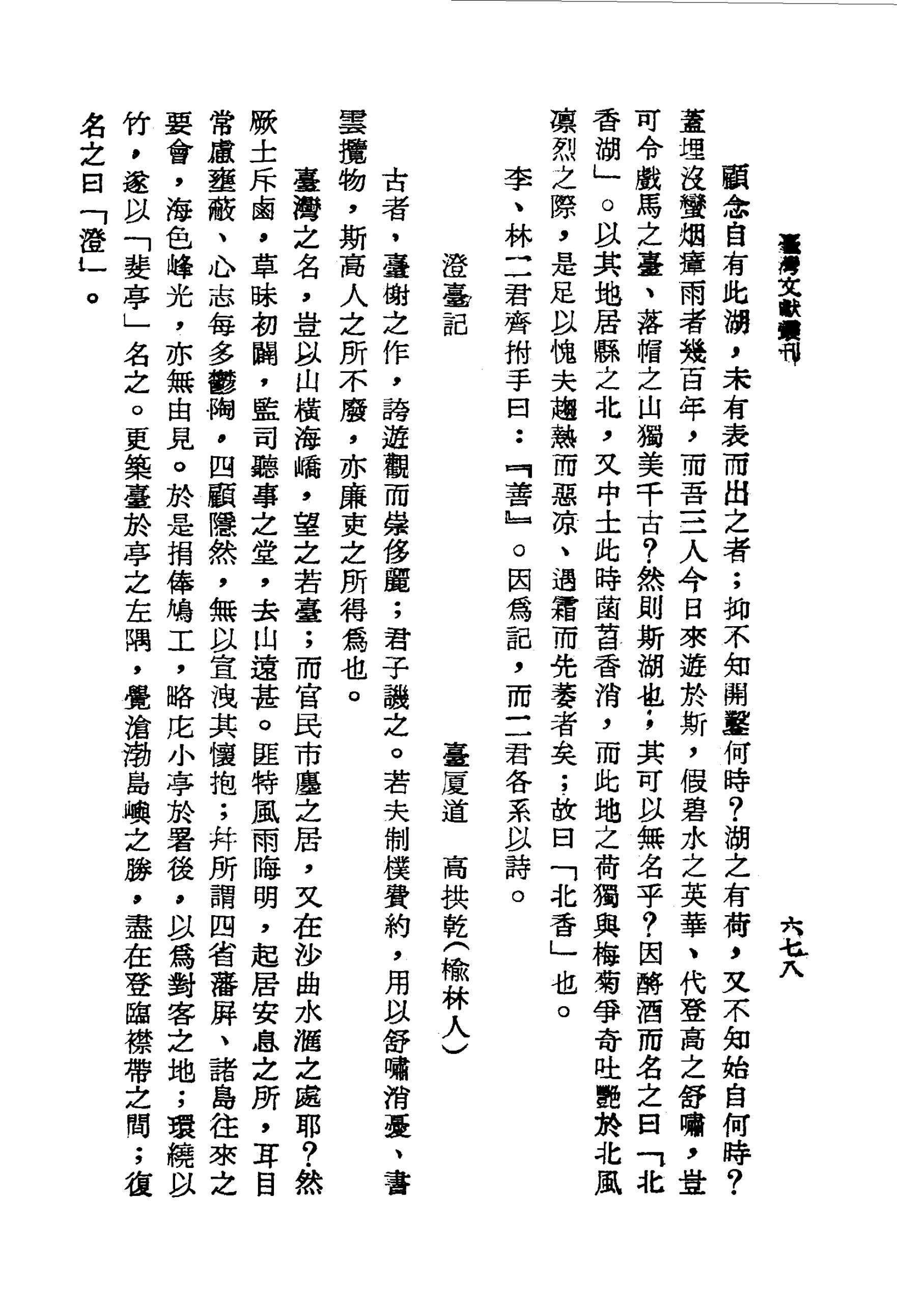 臺灣之名,豈以山橫海嶠,望之若臺;而官民市廛之居,又在沙曲水匯之處耶?然厥土斥鹵,草昧初闢,監司聽事之堂,去山遠甚。匪特風雨晦明,起居安息之所,耳目常慮壅蔽、心志每多鬱陶,四顧隱然,無以宣洩其懷抱;并所謂四省藩屏、諸島往來之要會,海色峯光,亦無由見。於是捐俸鳩工,略庀小亭於署後,以為對客之地;環繞以竹,遂以「斐亭」名之。更築臺於亭之左隅,覺滄渤島嶼之勝,盡在登臨襟帶之間;復名之曰「澄」。