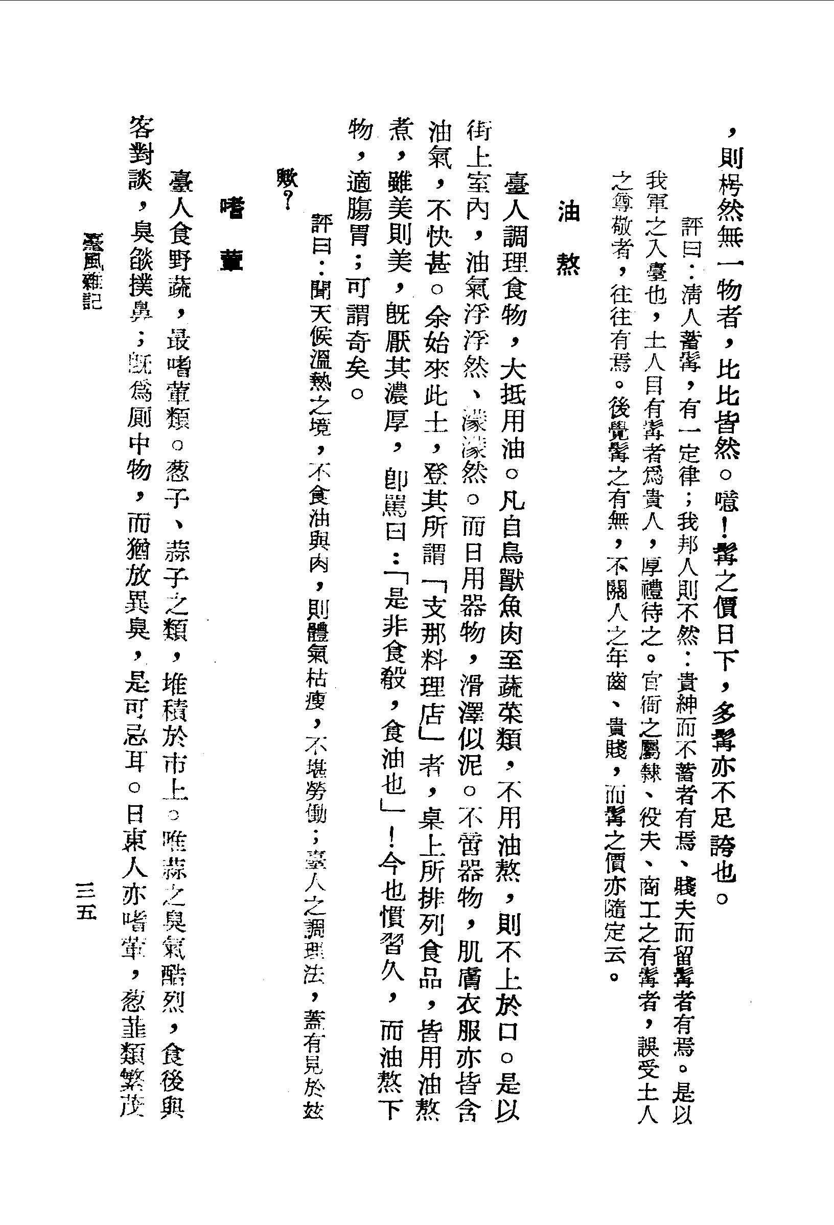 臺人調理食物,大抵用油。凡自鳥獸魚肉至蔬菜類,不用油熬,則不上於口。是以街上室內,油氣浮浮然、濛濛然。而日用器物,滑澤似泥。不啻器物,肌膚衣服亦皆含油氣,不快甚。余始來此土,登其所謂「支那料理店」者,桌上所排列食品,皆用油熬煮,雖美則美,既厭其濃厚,即罵曰:「是非食殽,食油也」!今也慣習久,而油熬下物,適腸胃;可謂奇矣。
