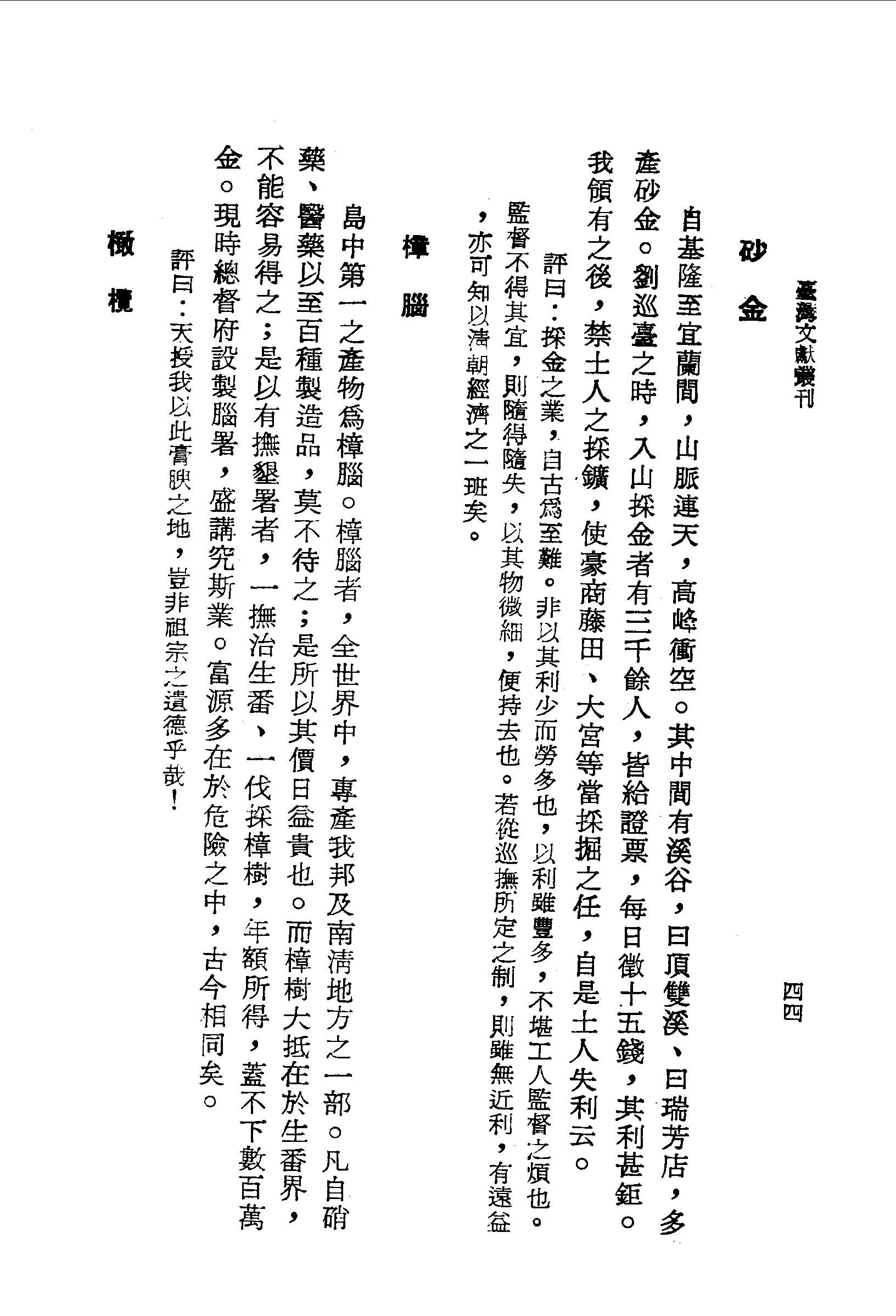 島中第一之產物為樟腦。樟腦者,全世界中,專產我邦及南清地方之一部。凡自硝藥、醫藥以至百種製造品,莫不待之;是所以其價日益貴也。而樟樹大抵在於生番界,不能容易得之;是以有撫墾署者,一撫治生番、一伐採樟樹,年額所得,蓋不下數百萬金。現時總督府設製腦署,盛講究斯業。富源多在於危險之中,古今相同矣。