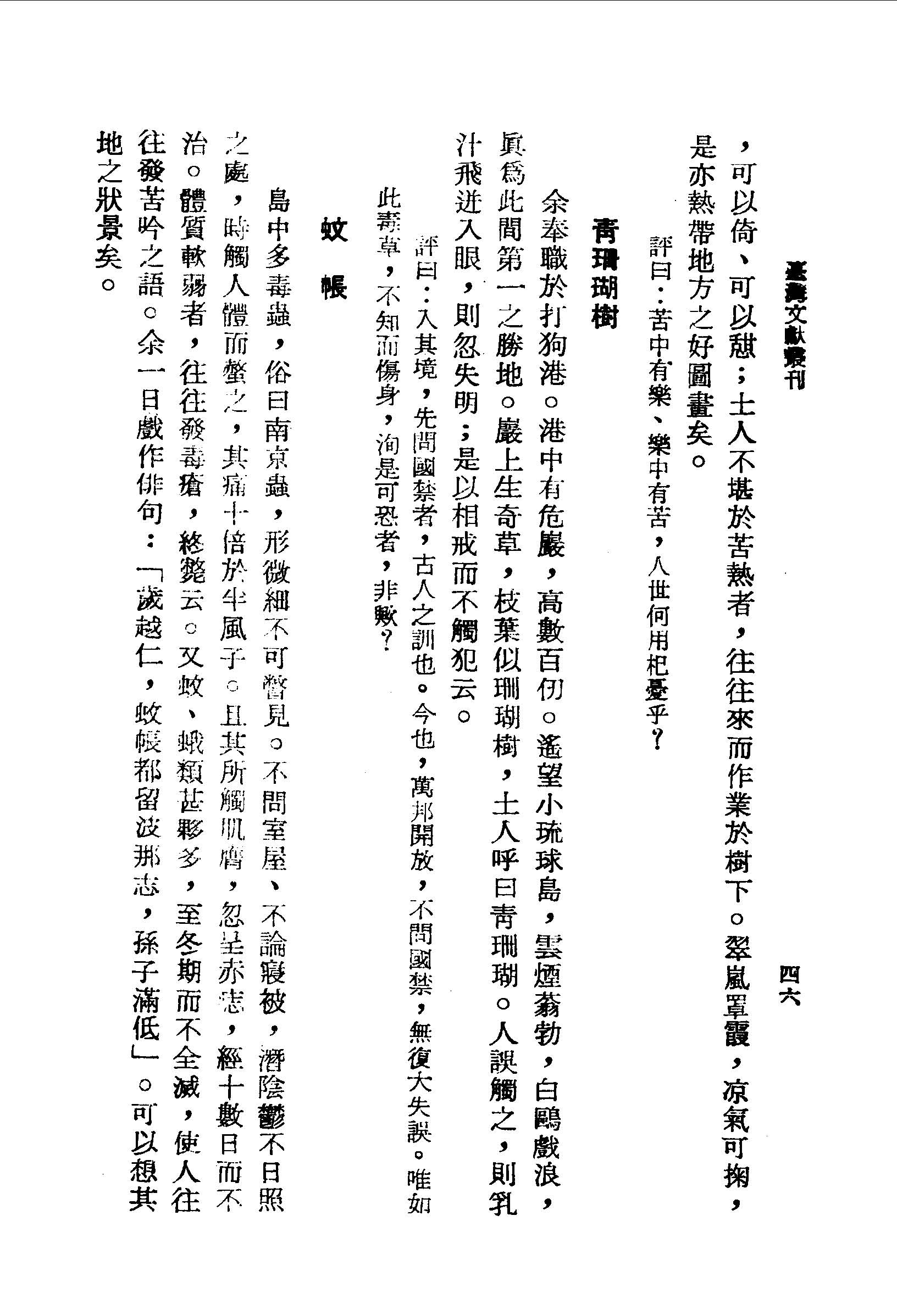 余奉職於打狗港。港中有危巖,高數百仞。遙望小琉球島,雲煙蓊勃,白鷗戲浪,真為此間第一之勝地。巖上生奇草,枝葉似珊瑚樹,土人呼曰青珊瑚。人誤觸之,則乳汁飛迸入眼,則忽失明;是以相戒而不觸犯云。