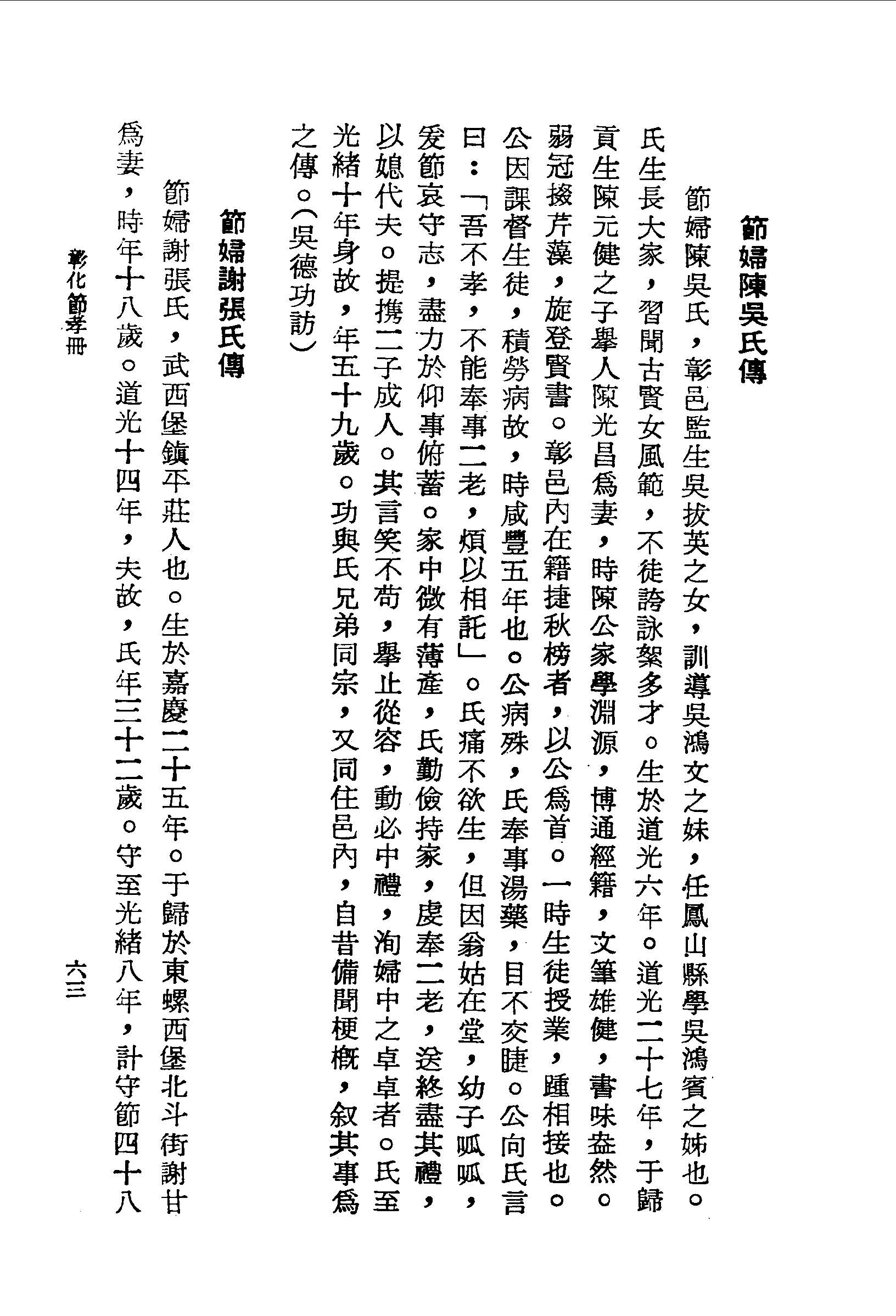 節婦陳吳氏,彰邑監生吳拔英之女,訓導吳鴻文之妹,任鳳山縣學吳鴻賓之姊也。氏生長大家,習聞古賢女風範,不徒誇詠絮多才。生於道光六年。道光二十七年,于歸貢生陳元健之子舉人陳光昌為妻,時陳公家學淵源,博通經籍,文筆雄健,書味盎然。弱冠掇芹藻,旋登賢書。彰邑內在籍捷秋榜者,以公為首。一時生徒授業,踵相接也。公因課督生徒,積勞病故,時咸豐五年也。公病殊,氏奉事湯藥,目不交睫。