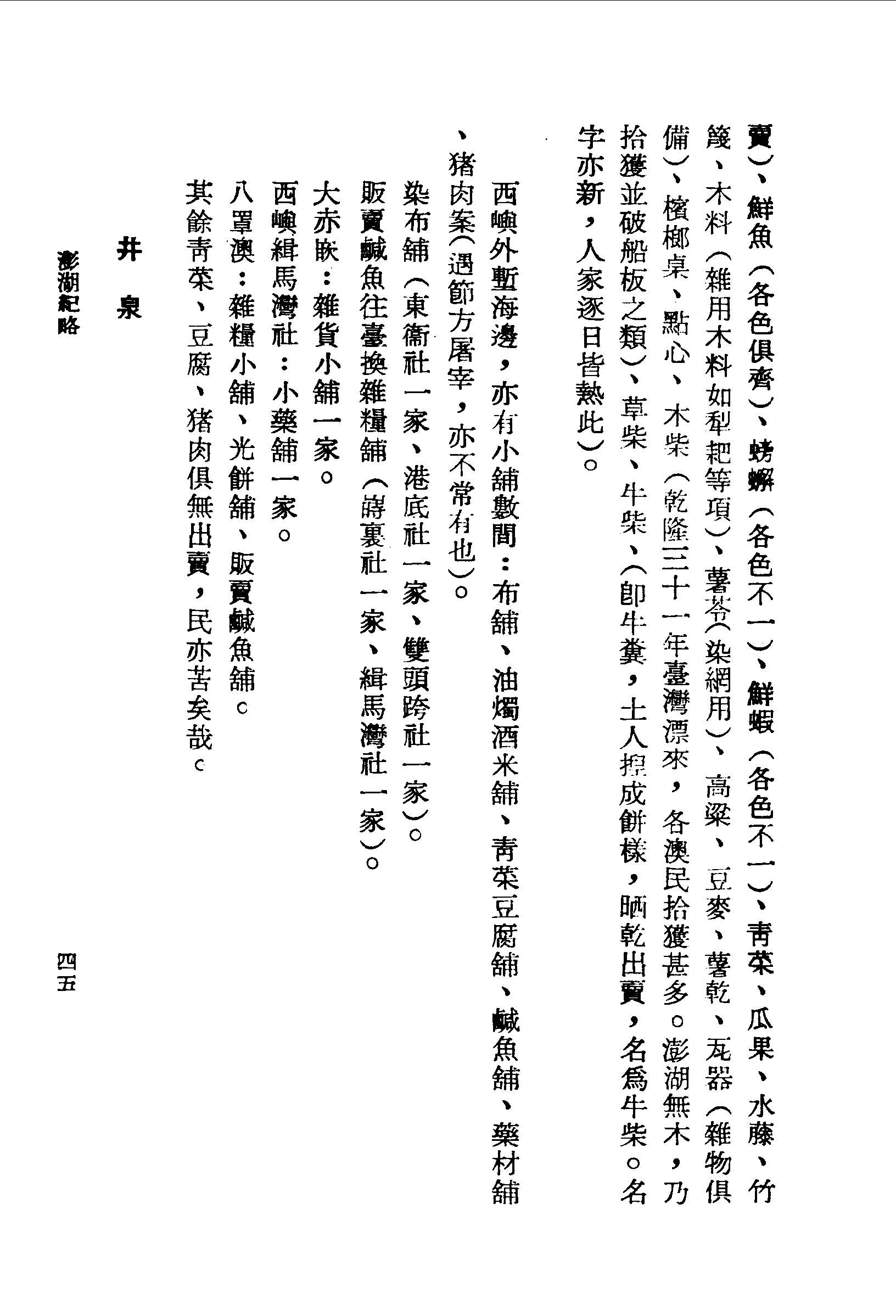 西嶼外塹海邊,亦有小舖數間:布舖、油燭酒米舖、青菜豆腐舖、鹹魚舖、藥材舖、豬肉案(遇節方屠宰,亦不常有也).