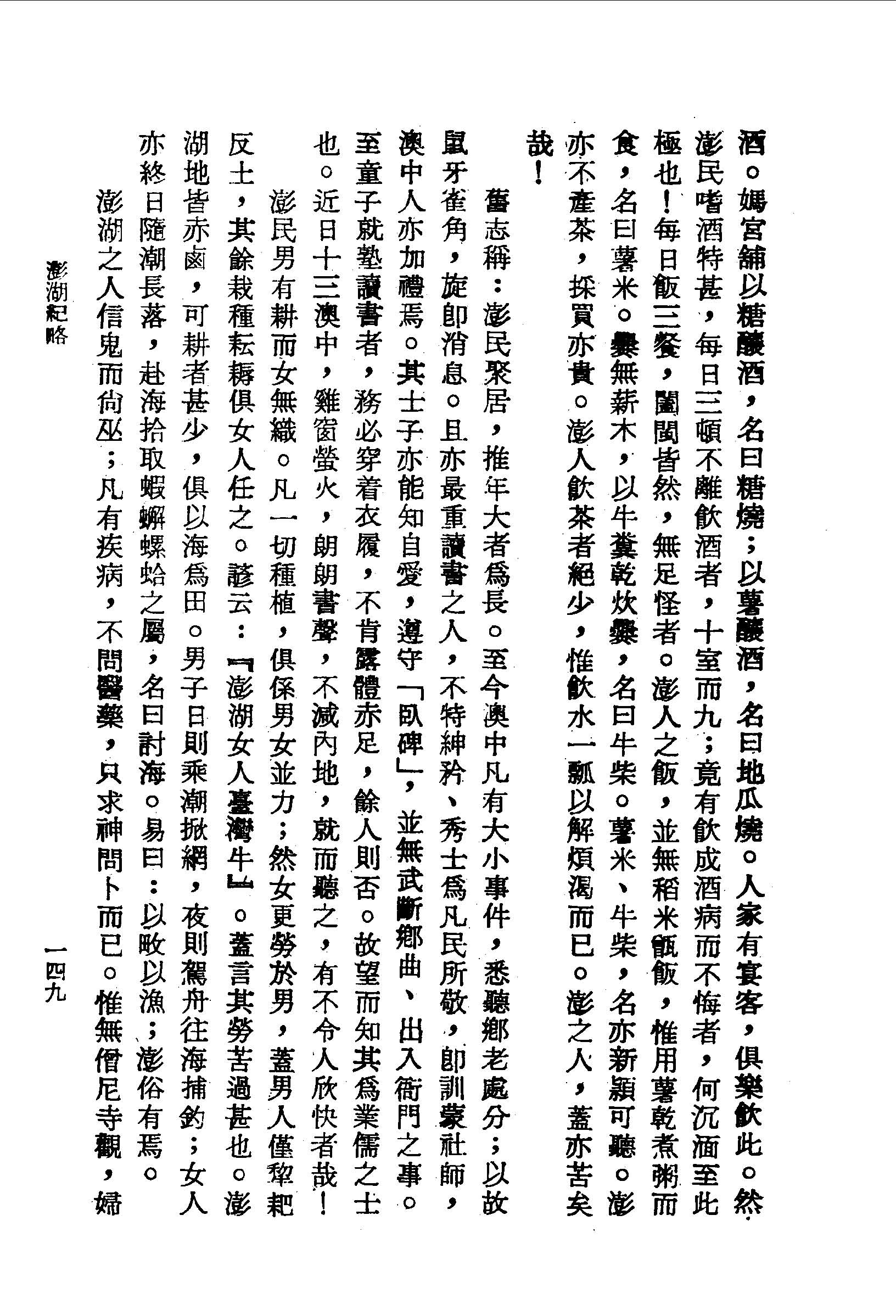 至釀秫為酒,澎地並無秫酒。媽宮舖以糖釀酒,名曰糖燒;以薯釀酒,名曰地瓜燒。人家有宴客,俱樂飲此。然澎民嗜酒特甚,每日三頓不離飲酒者,十室而九;竟有飲成酒病而不悔者,何沉湎至此極也!