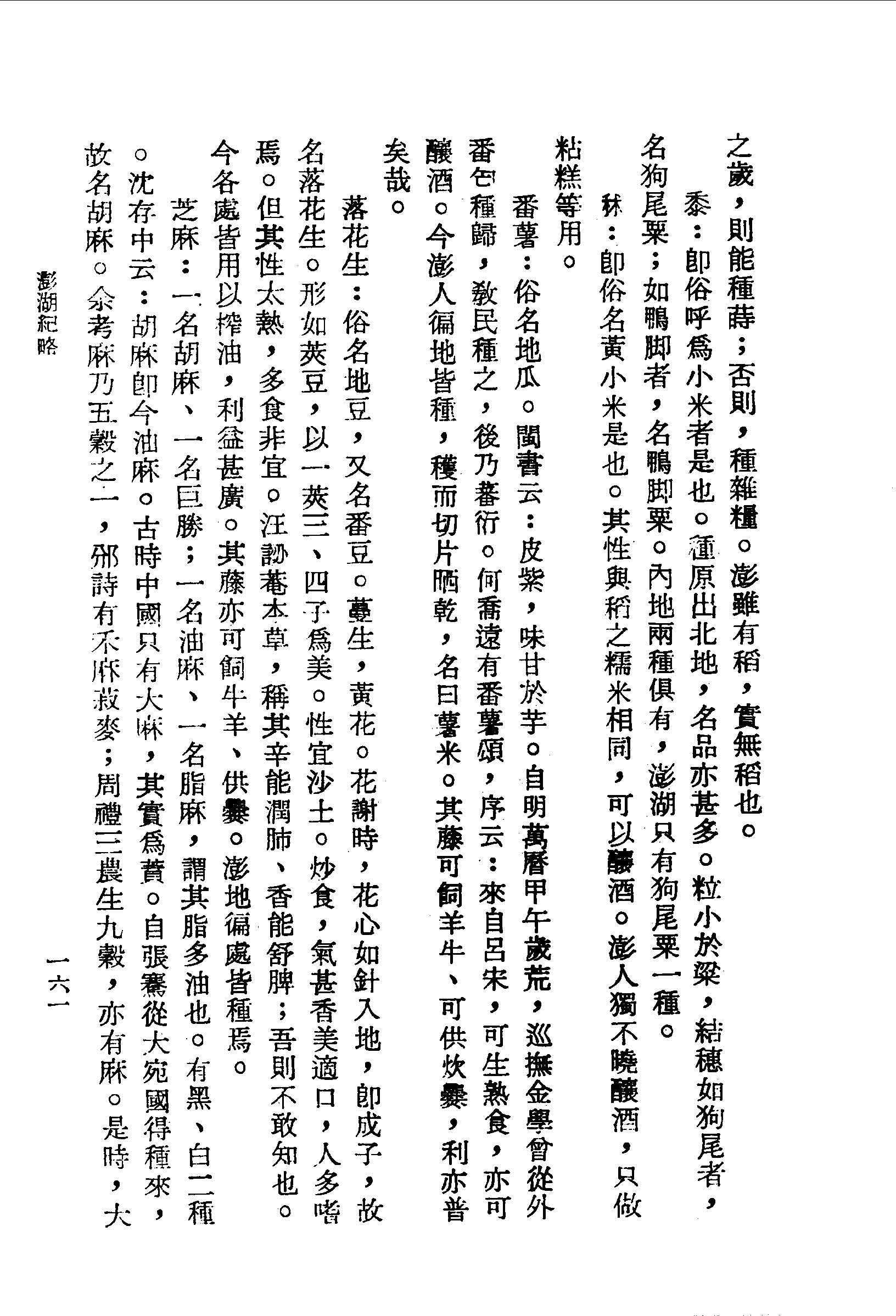 落花生:俗名地豆,又名番豆.蔓生,黃花.花謝時,花心如針入地,即成子,故名落花生.形如莢豆,以一莢三、四子為美.性宜沙土.炒食,氣甚香美適口,人多嗜焉.但其性太熱,多食非宜.汪訒菴本草,稱其辛能潤肺、香能舒脾;吾則不敢知也.今各處皆用以榨油,利益甚廣.其藤亦可飼牛羊、供爨.澎地遍處皆種焉。