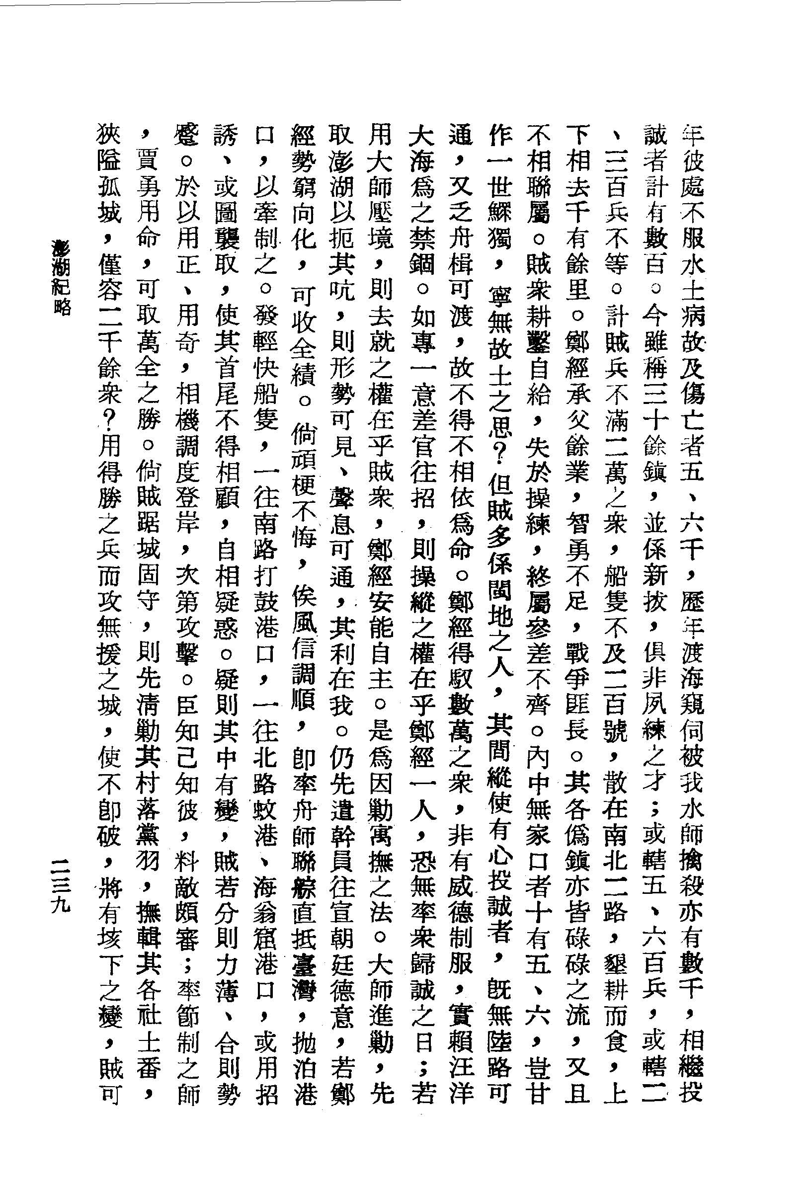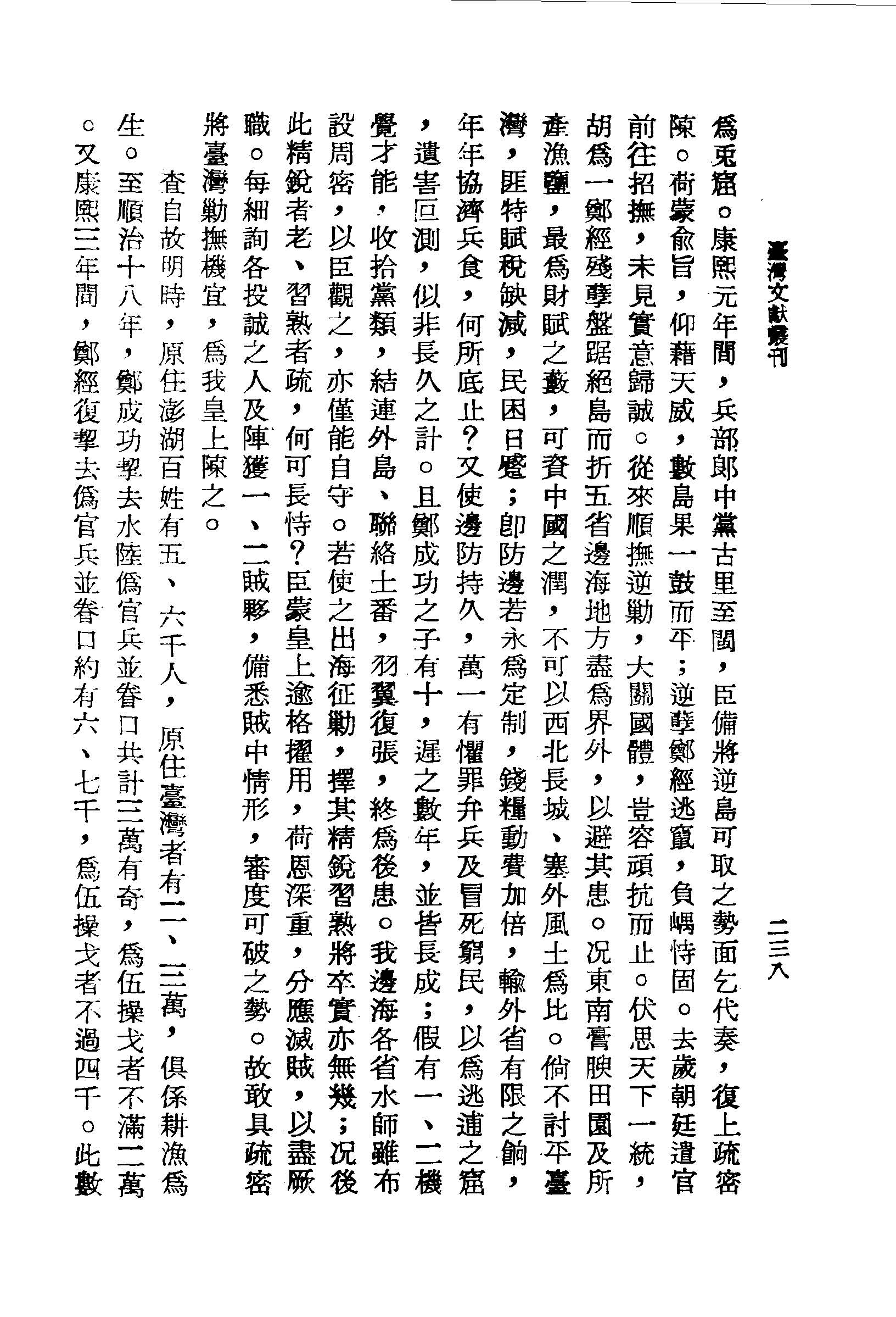 查自故明時,原住澎湖百姓有五、六千人,原住臺灣者有二、三萬,俱係耕漁為生。至順治十八年,鄭成功挈去水陸偽官兵並眷口共計三萬有奇,為伍操戈者不滿二萬。又康熙三年間,鄭經復挈去偽官兵並眷口約有六、七千,為伍操戈者不過四千。此數年彼處不服水土病故及傷亡者五、六千,歷年渡海窺伺被我水師擒殺亦有數千,相繼投誠者計有數百。今雖稱三十餘鎮,並係新拔,俱非夙練之才;或轄五、六百兵,或轄二、三百兵不等。計賊兵不滿二萬之眾,船隻不及二百號,散在南北二路,墾耕而食,上下相去千有餘里