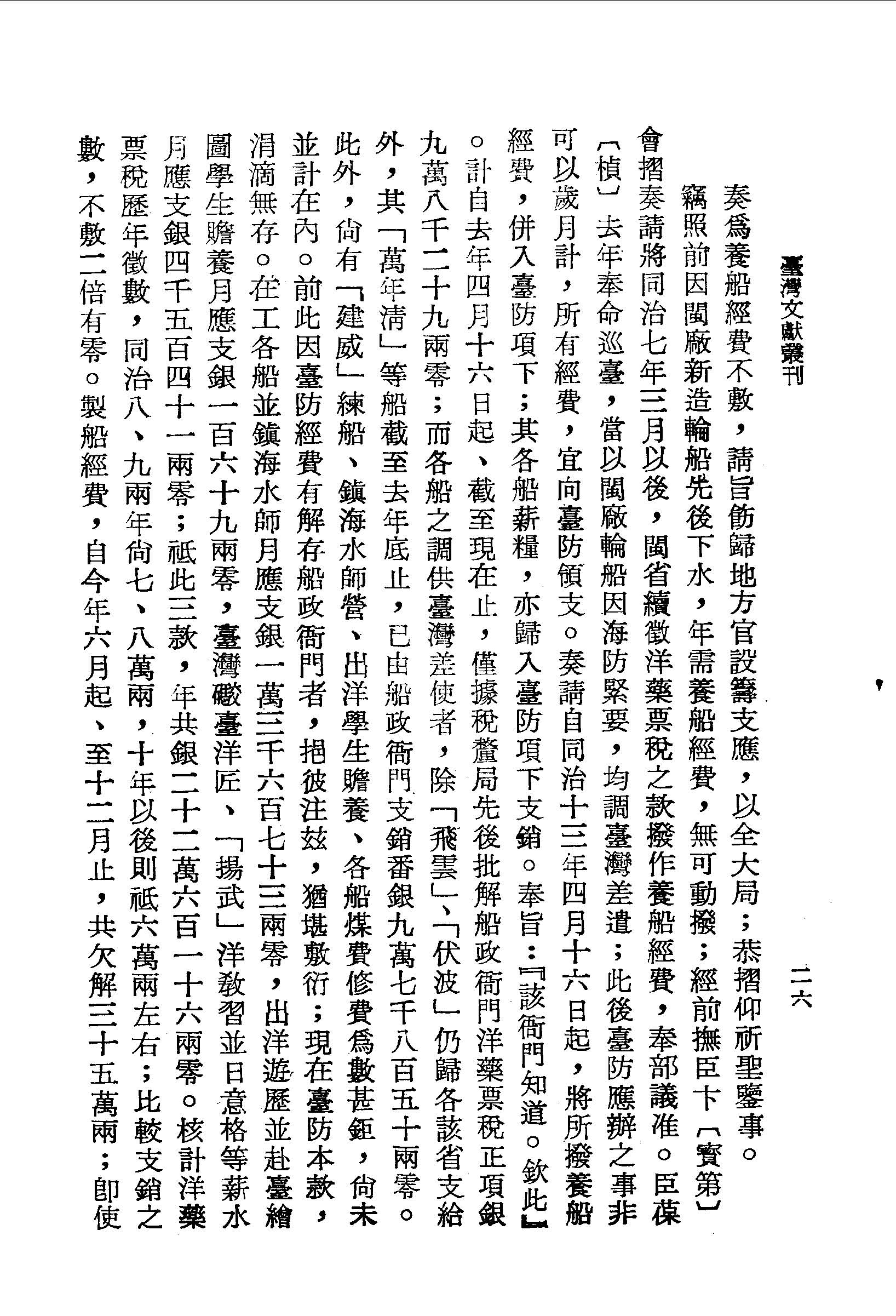 計自去年四月十六日起、截至現在止,僅據稅釐局先後批解船政衙門洋藥票稅正項銀九萬八千二十九兩零;而各船之調供臺灣差使者,除「飛雲」、「伏波」仍歸各該省支給外,其「萬年清」等船截至去年底止,已由船政衙門支銷番銀九萬七千八百五十兩零。此外,尚有「建威」練船、鎮海水師營、出洋學生贍養、各船煤費修費為數甚鉅,尚未並計在內。前此因臺防經費有解存船政衙門者,挹彼注茲,猶堪敷衍;現在臺防本款,涓滴無存。