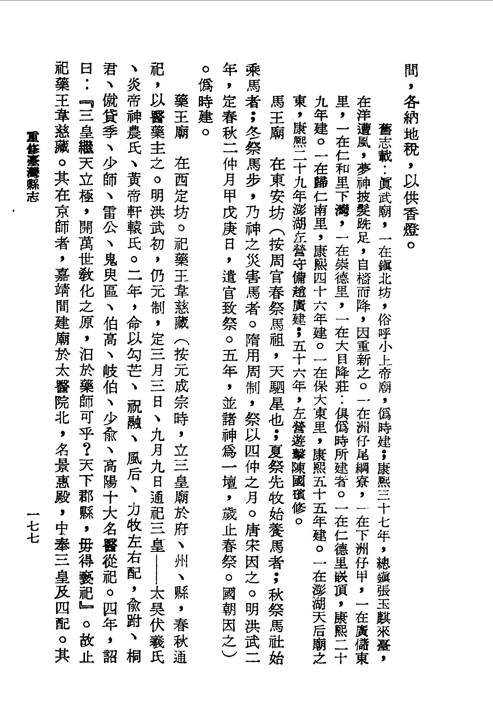 藥王廟:在西定坊.祀藥王韋慈藏(按元成宗時,立三皇廟於府、州、縣,春秋通祀,以醫藥主之.明洪武初,仍元制,定三月三日、九月九日通祀三皇──太昊伏羲氏、炎帝神農氏、黃帝軒轅氏.二年,命以勾芒、祝融、風后、力牧左右配,俞跗、桐君、僦貸季、少師、雷公、鬼臾區、伯高、岐伯、少俞、高陽十大名醫從祀.四年,詔曰:『三皇繼天立極,開萬世教化之原,汨於藥師可乎?天下郡縣,毋得褻祀』.故止祀藥王韋慈藏.其在京師者,嘉靖間建廟於太醫院北,名景惠殿,中奉三皇及四配.其從祀:東廡則僦貸季、天師岐伯、鬼臾區、伯高、俞跗、少師、桐君、太乙雷公、馬師皇、伊尹、神應王扁鵲、倉公淳于意、張機十三人;西廡則華陀、王叔和、皇甫謐、抱朴子葛洪、巢元方、真人孫思邈、藥王韋慈藏、啟元子王冰、錢乙、朱肱、李杲、劉完素、朱彥修十四人(?).國朝順治元年,增少俞於東廡俞跗之次為十四人.定每歲春冬仲月上甲日祀先醫.遣禮部堂官致祭三皇,太醫院官分獻兩廡).康熙五十七年,道標千總姚廣建。
