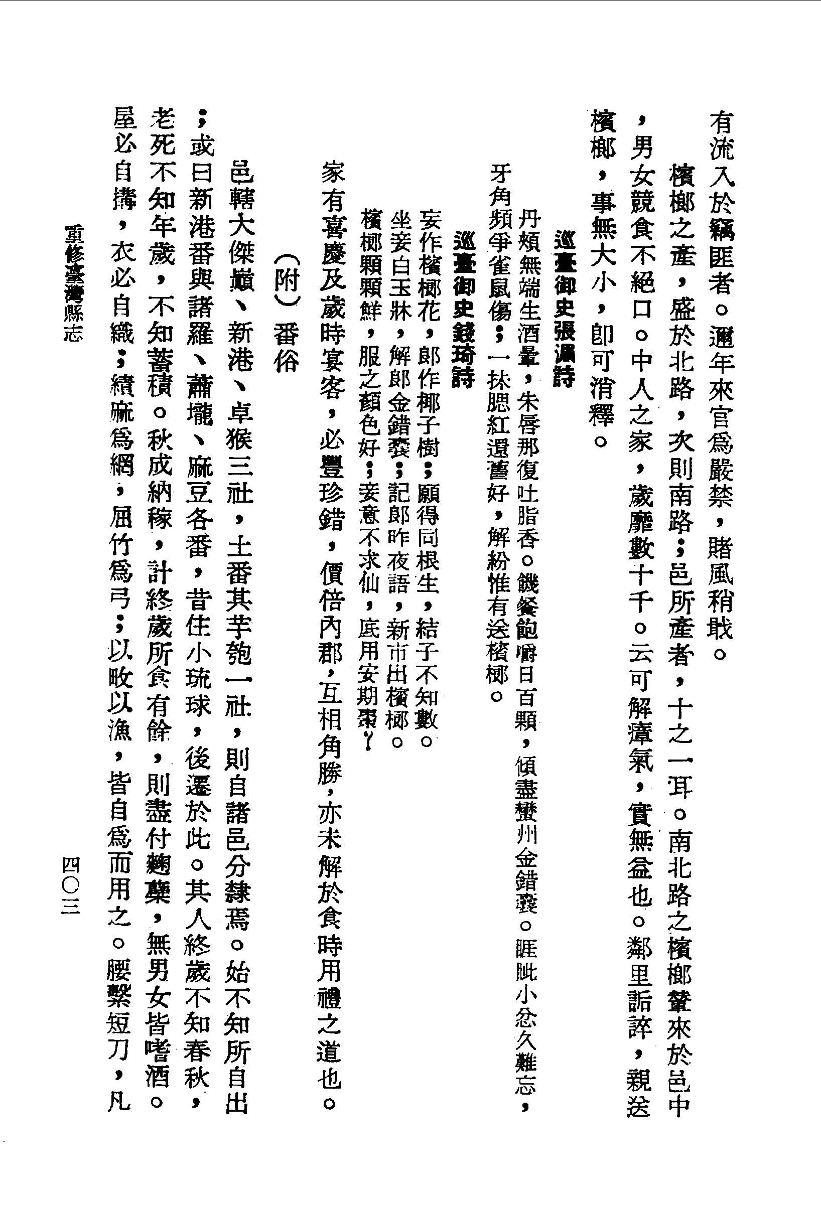 檳榔之產,盛於北路,次則南路;邑所產者,十之一耳。南北路之檳榔輦來於邑中,男女競食不絕口。中人之家,歲靡數十千。云可解瘴氣,實無益也。鄰里詬誶,親送檳榔,事無大小,即可消釋。