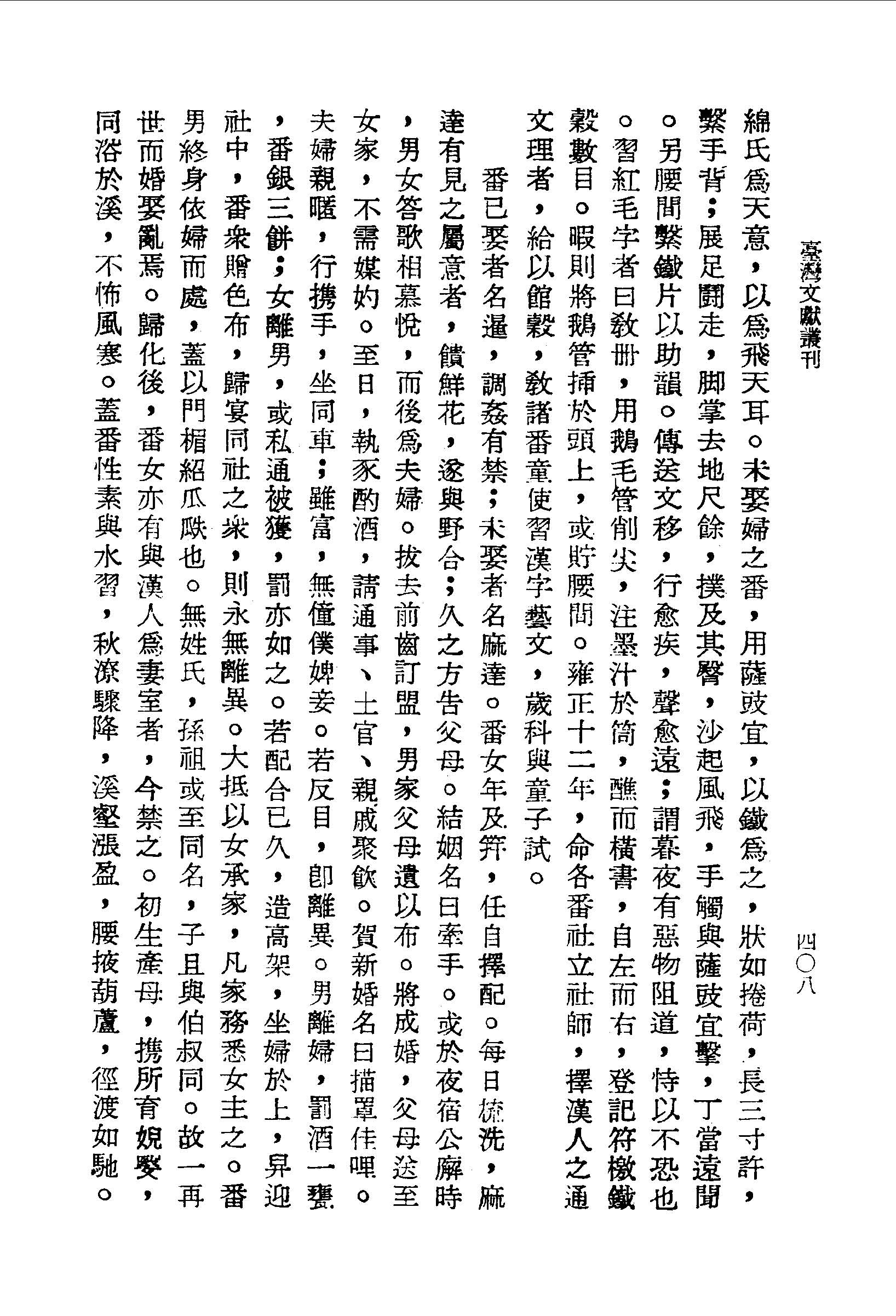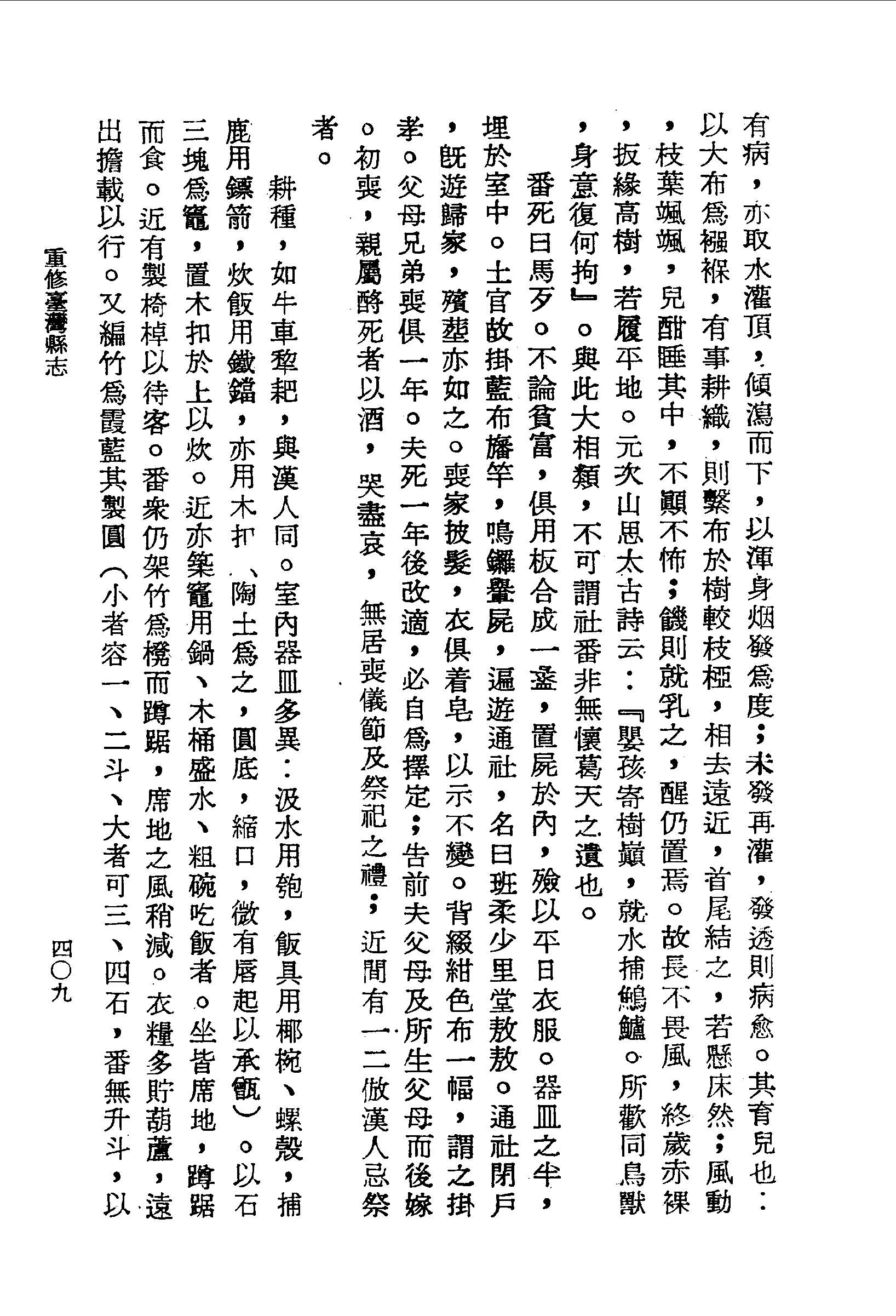 初生產母,携所育婗嫛,同浴於溪,不怖風寒。蓋番性素與水習,秋潦驟降,溪壑漲盈,腰掖葫蘆,徑渡如馳。有病,亦取水灌頂,傾瀉而下,以渾身烟發為度;未發再灌,發透則病愈。