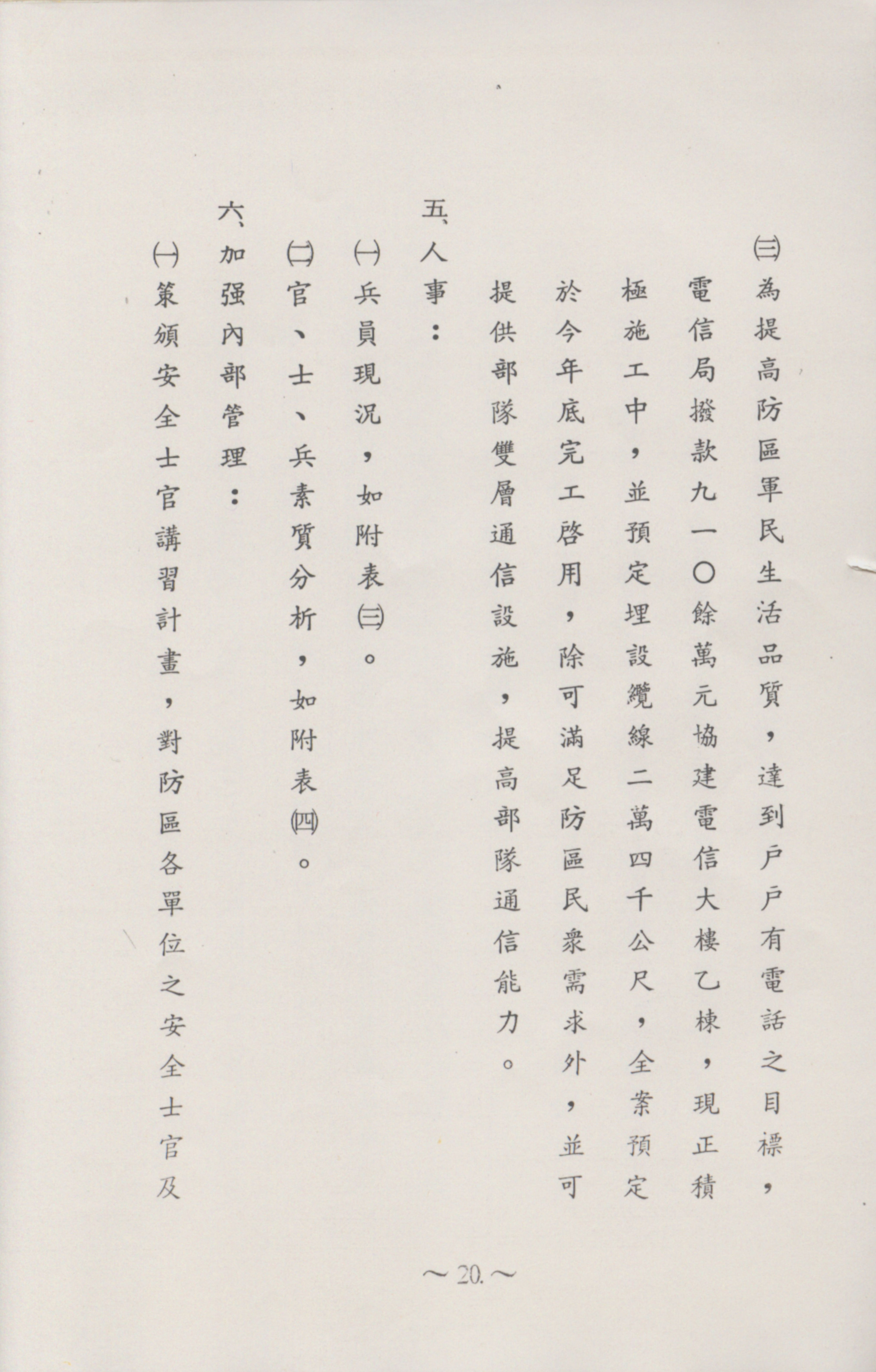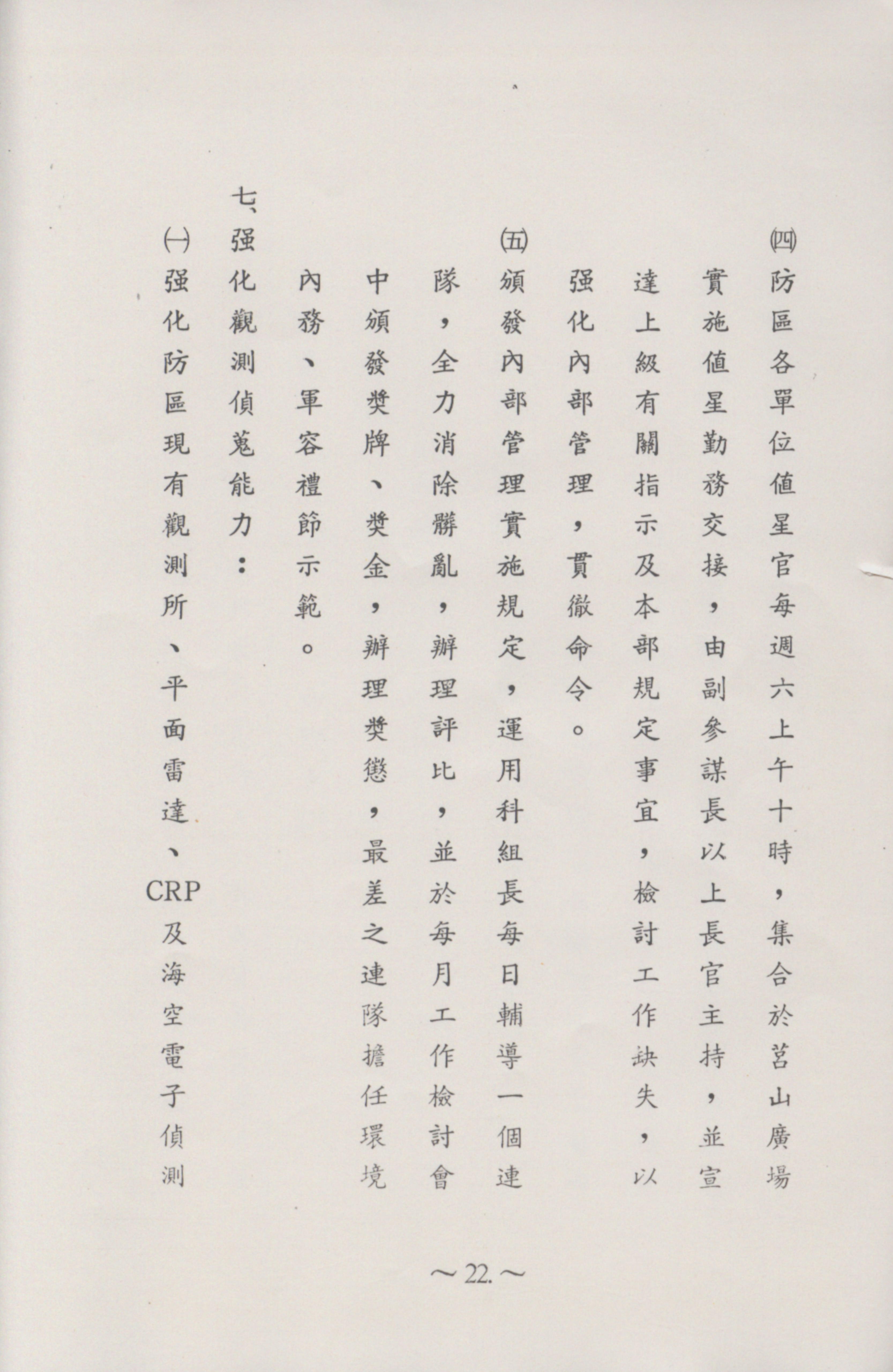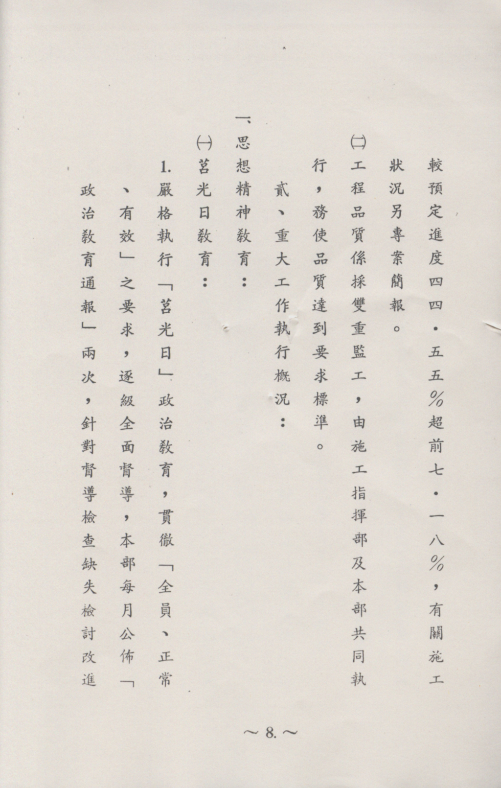 簡報內容可分兩大重點,分別是前次視察受指示須執行事項,以及重大工作執行概況。 重大工作執行概況主要項目有: 精神思想教育、軍紀安全、增進官兵生活服務、積極整建戰地服務,鞏固軍民關係、人事、加強內部管理、強化官策偵蒐能力、戰備訓練、落實正常後勤設備。