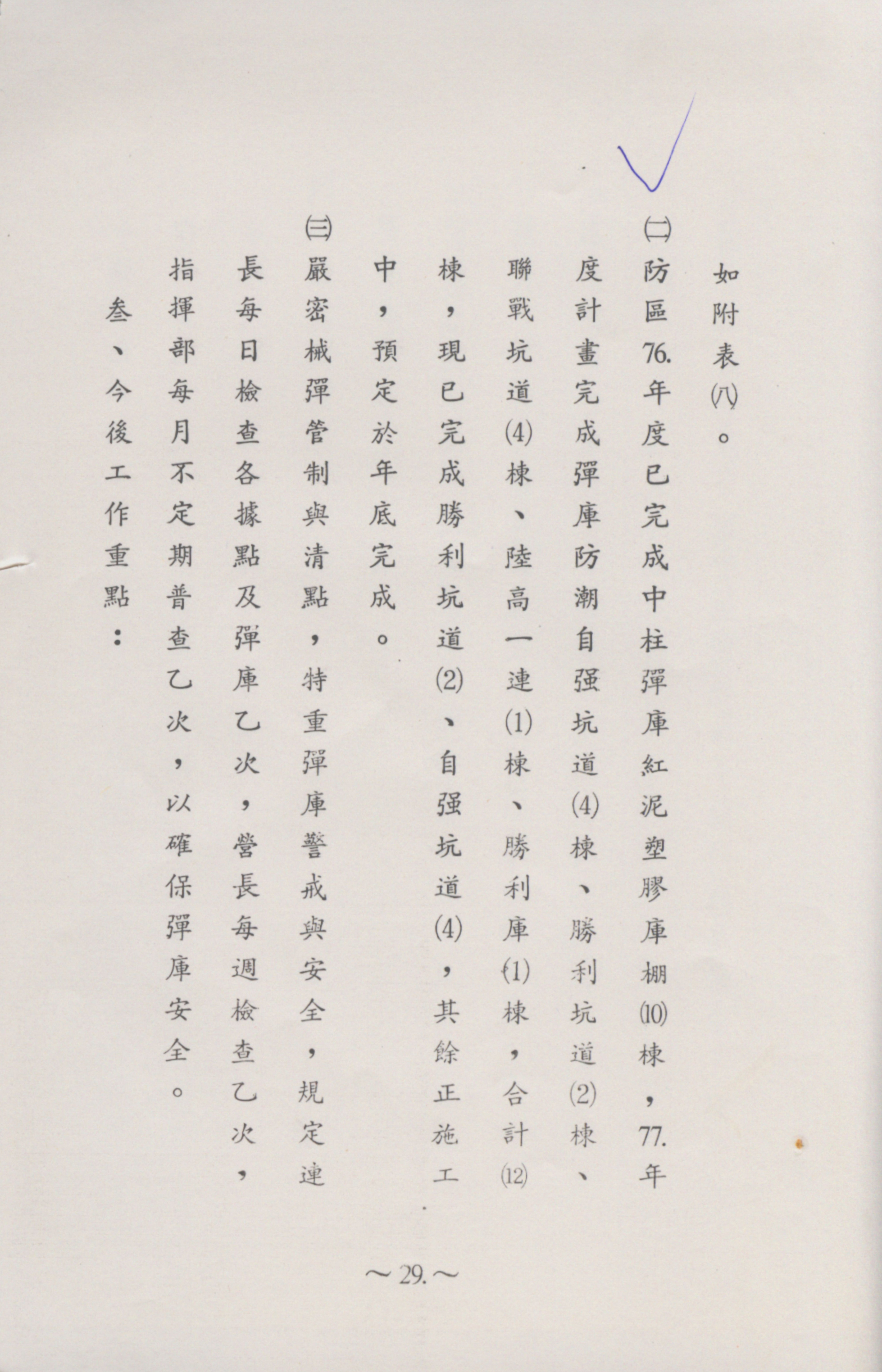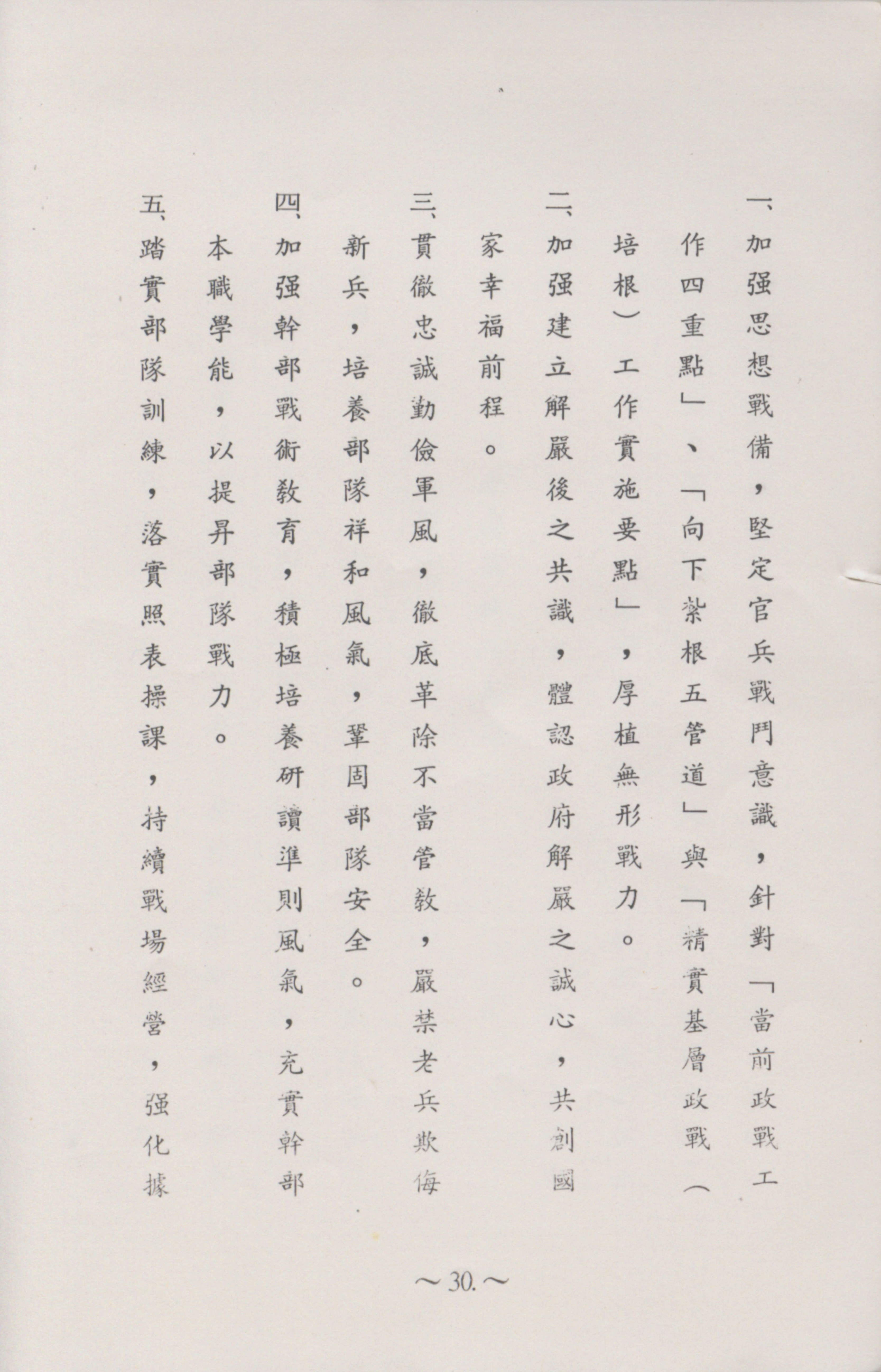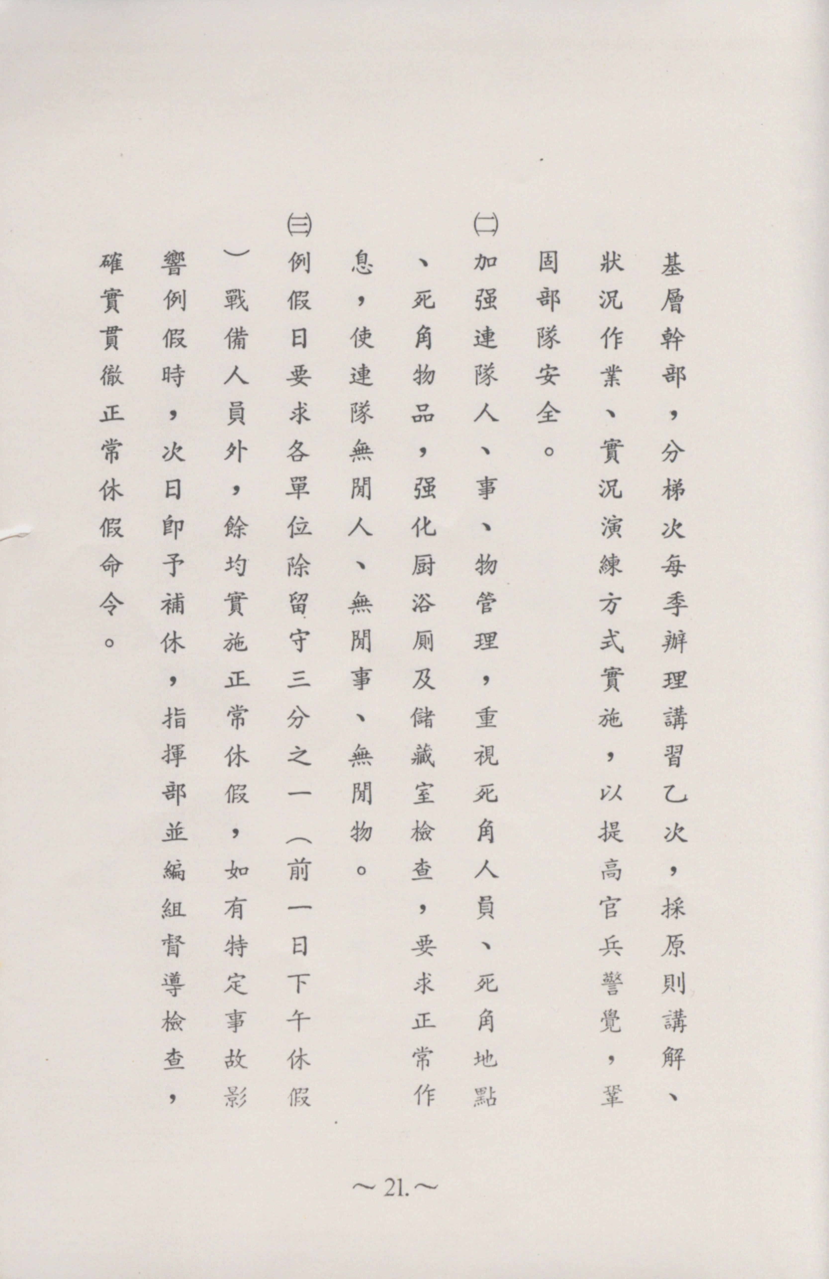 簡報內容可分兩大重點,分別是前次視察受指示須執行事項,以及重大工作執行概況。 重大工作執行概況主要項目有: 精神思想教育、軍紀安全、增進官兵生活服務、積極整建戰地服務,鞏固軍民關係、人事、加強內部管理、強化官策偵蒐能力、戰備訓練、落實正常後勤設備。