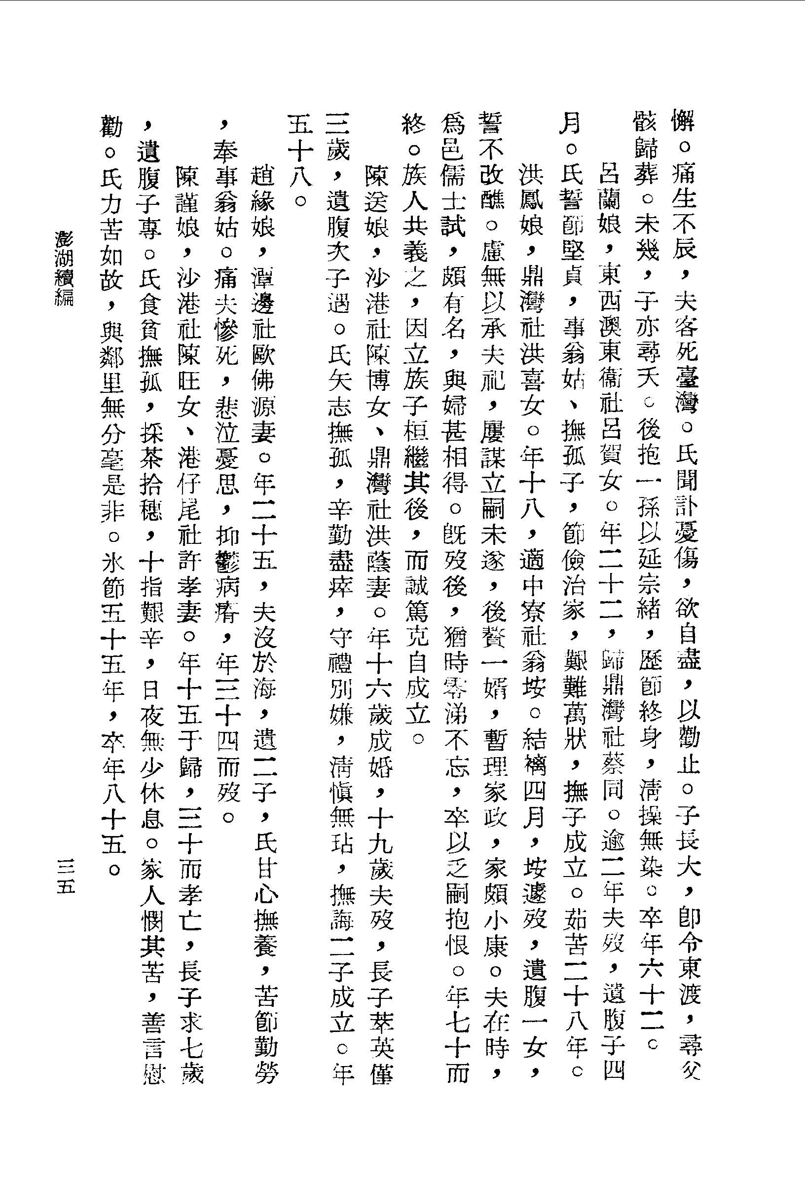 趙緣娘,潭邊社歐佛源妻。年二十五,夫沒於海,遺二子,氏甘心撫養,苦節勤勞,奉事翁姑。痛夫慘死,悲泣憂思,抑鬱病瘠,年三十四而歿。