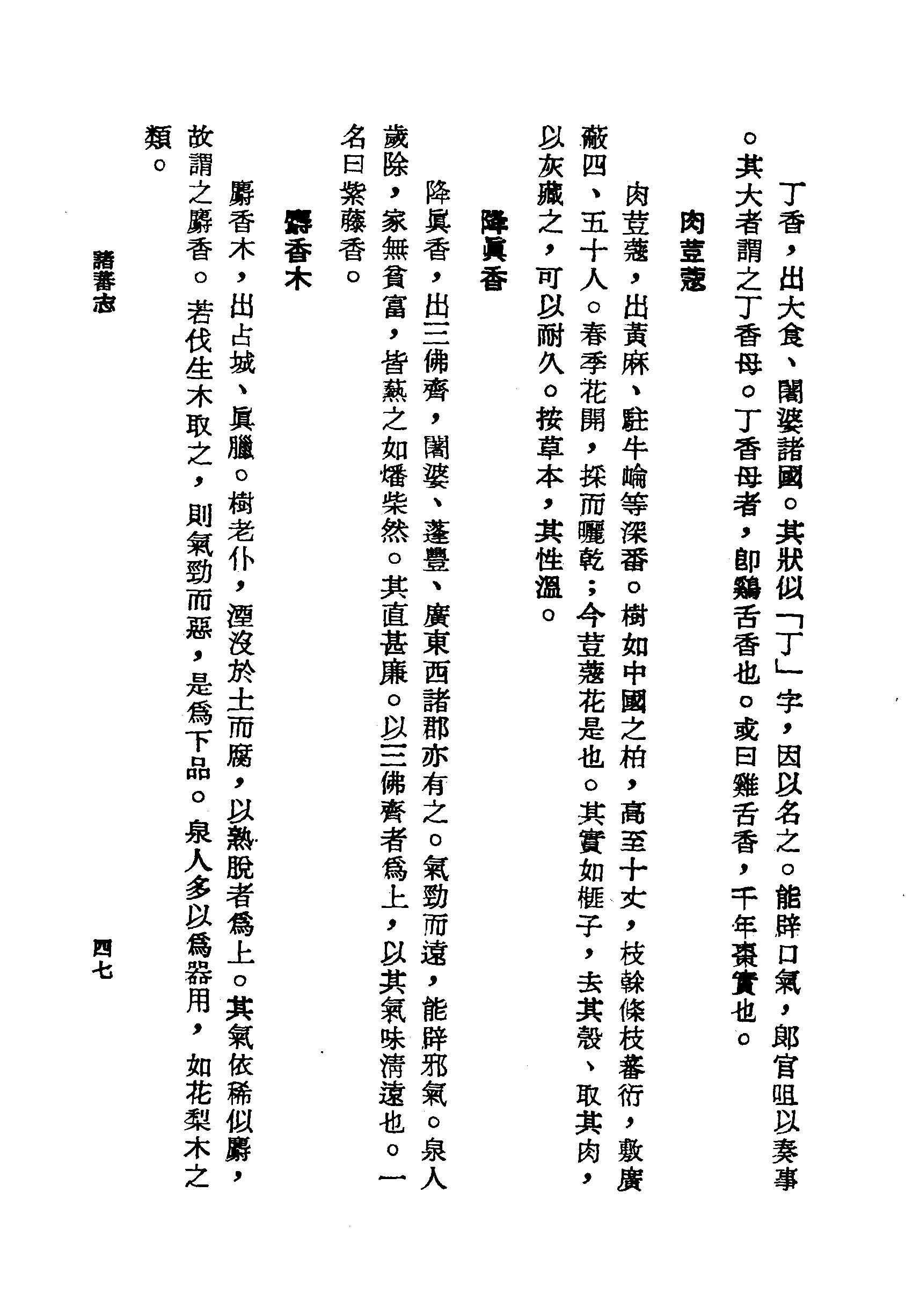 丁香,出大食、闍婆諸國。其狀似「丁」字,因以名之。能辟口氣,郎官咀以奏事。其大者謂之丁香母。丁香母者,即雞舌香也。或曰雞舌香,千年棗實也。