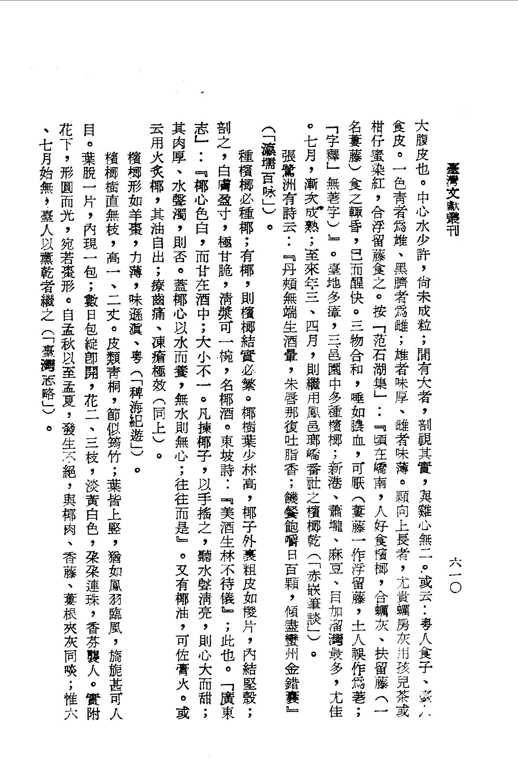 種檳榔必種椰;有椰,則檳榔結實必繁。椰樹葉少林高,椰子外裹粗皮如椶片,內結堅殼;剖之,白膚盈寸,極甘脆,清漿可一椀,名椰酒。東坡詩:『美酒生林不待儀』;此也。「廣東志」:『椰心色白,而甘在酒中;大小不一。凡揀椰子,以手搖之,聽水聲清亮,則心大而甜;其肉厚、水聲濁,則否。蓋椰心以水而養,無水則無心;往往而是』。又有椰油,可佐膏火。或云用火炙椰,其油自出;療齒痛、凍瘡極效(同上)。