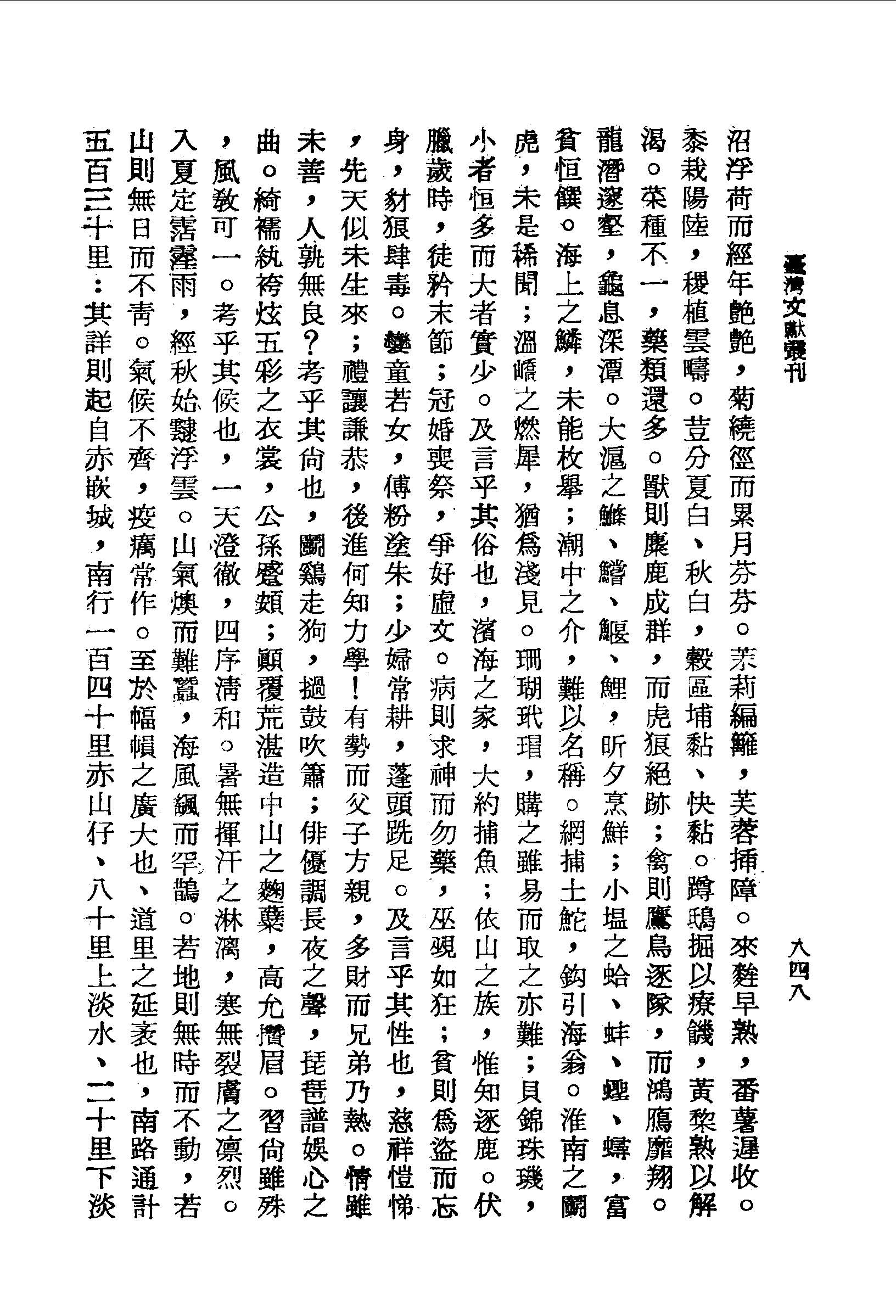 來麰早熟,番薯遲收。黍栽陽陸,稷植雲疇。荳分夏白、秋白,穀區埔黏、快黏。蹲鴟掘以療饑,黃棃熟以解渴。菜種不一,藥類還多。