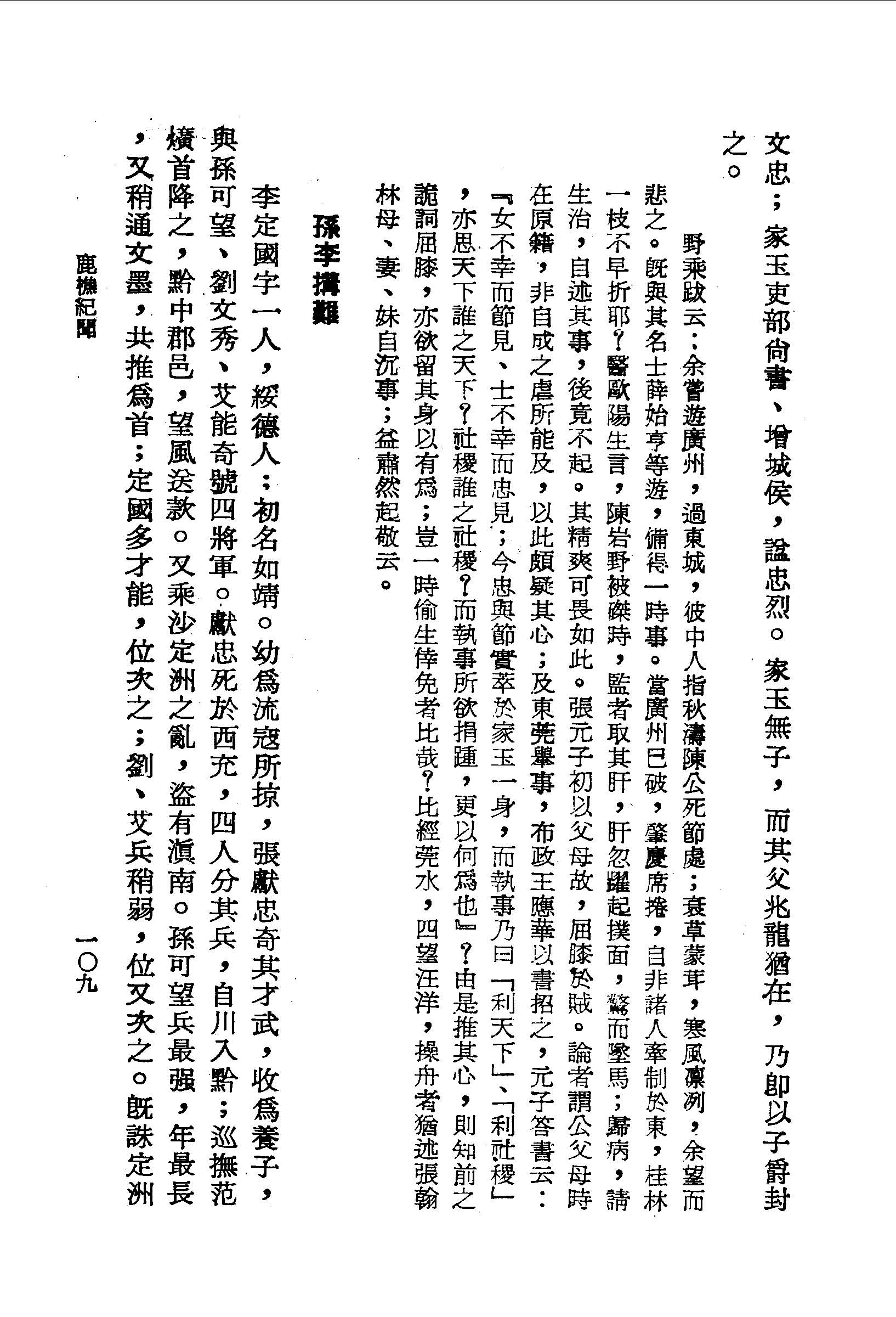 野乘跋云:余嘗遊廣州,過東城,彼中人指秋濤陳公死節處;衰草蒙茸,寒風凜冽,余望而悲之。既與其名士薛始亨等遊,備得一時事。當廣州已破,肇慶席捲,自非諸人牽制於東,桂林一枝不早折耶?醫歐陽生言,陳岩野被磔時,監者取其肝,肝忽躍起撲面,驚而墜馬;歸病,請生治,自述其事,後竟不起。其精爽可畏如此。張元子初以父母故,屈膝於賊。論者謂公父母時在原籍,非自成之虐所能及,以此頗疑其心;及東莞舉事,布政王應華以書招之,元子答書云:『女不幸而節見、士不幸而忠見;今忠與節實萃於家玉一身,而執事乃曰「利天下」、「利社稷」,亦思天下誰之天下?社稷誰之社稷?而執事所欲捐踵,更以何為也』?由是推其心,則知前之詭詞屈膝,亦欲留其身以有為;豈一時偷生倖免者比哉?比經莞水,四望汪洋,操舟者猶述張翰林母、妻、妹自沉事;益肅然起敬云。