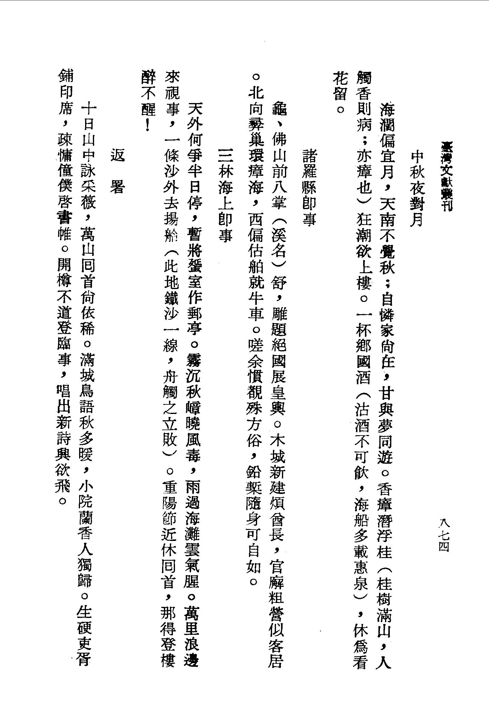 海闊偏宜月,天南不覺秋;自憐家尚在,甘與夢同遊。香瘴潛浮桂(桂樹滿山,人觸香則病;亦瘴也)狂潮欲上樓。一杯鄉國酒(沽酒不可飲,海船多載惠泉),休為看花留。