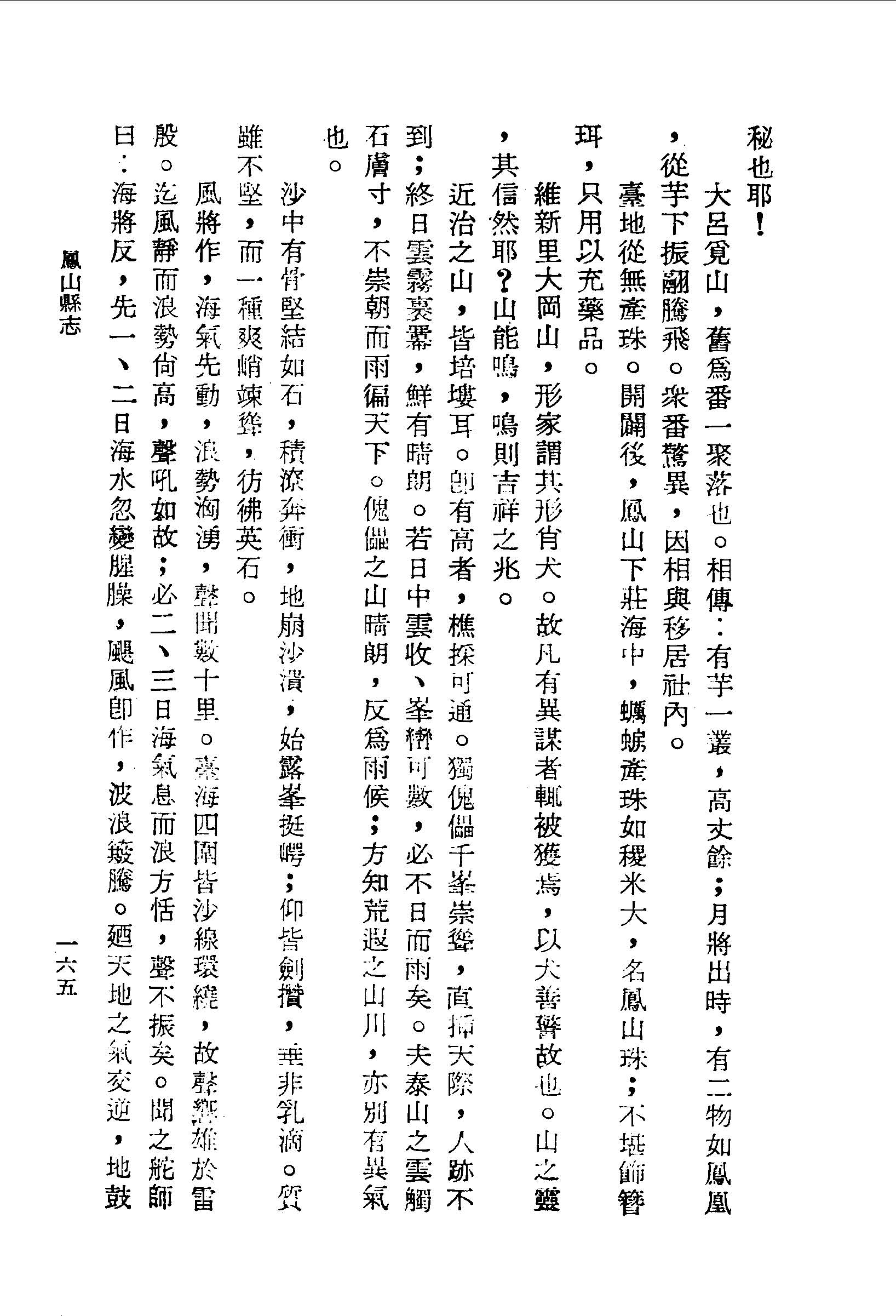 臺地從無產珠.開闢後,鳳山下莊海中,蠣產珠如稷米大,名鳳山珠;不堪飾簪珥,只用以充藥品。