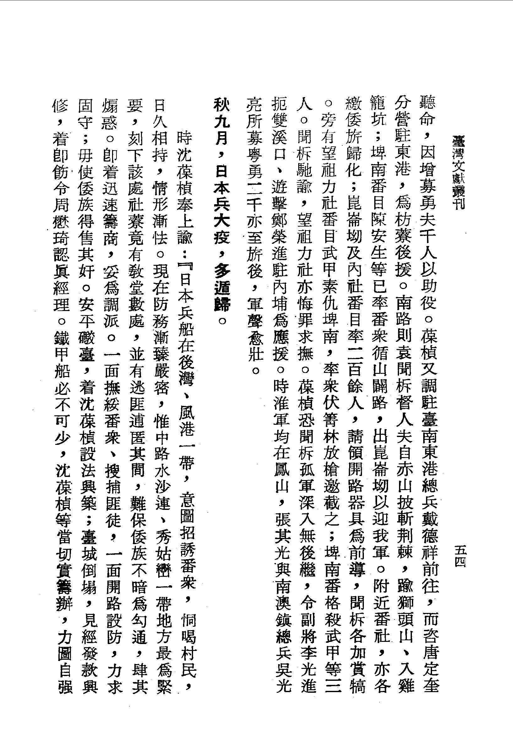 時沈葆楨奉上諭:日本兵船在後灣、風港一帶,意圖招誘番眾,恫喝村民,日久相持,情形漸怯。現在防務漸臻嚴密,惟中路水沙連、秀姑巒一帶地方最為緊要,刻下該處社寮竟有教堂數處,並有逃匪逋匿其間,難保倭族不暗為勾通,肆其煽惑。即著迅速籌商,妥為調派。一面撫綏番眾、搜捕匪徒,一面開路設防,力求固守;毋使倭族得售其奸。 秋九月,日本兵大疫,多遁歸。