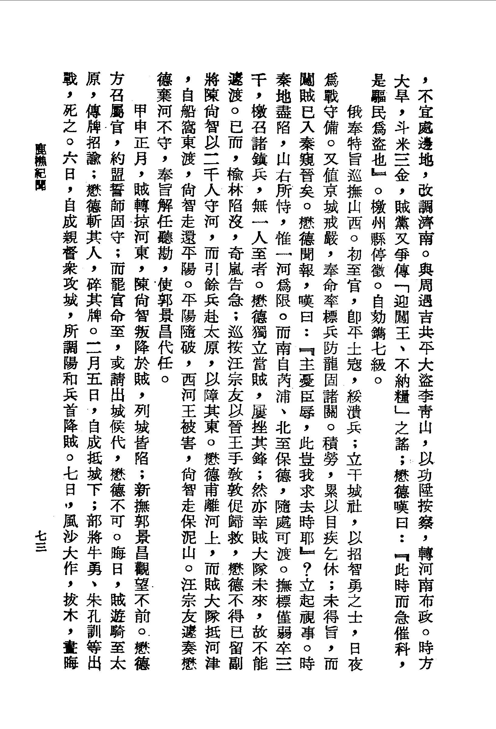 俄奉特旨巡撫山西。初至官,即平土寇,綏潰兵;立干城社,以招智勇之士,日夜為戰守備。又值京城戒嚴,奉命率標兵防龍固諸關。積勞,累以目疾乞休;未得旨,而闖賊已入秦窺晉矣。懋德聞報,嘆曰:『主憂臣辱,此豈我求去時耶』?立起視事。時秦地盡陷,山右所恃,惟一河為限。