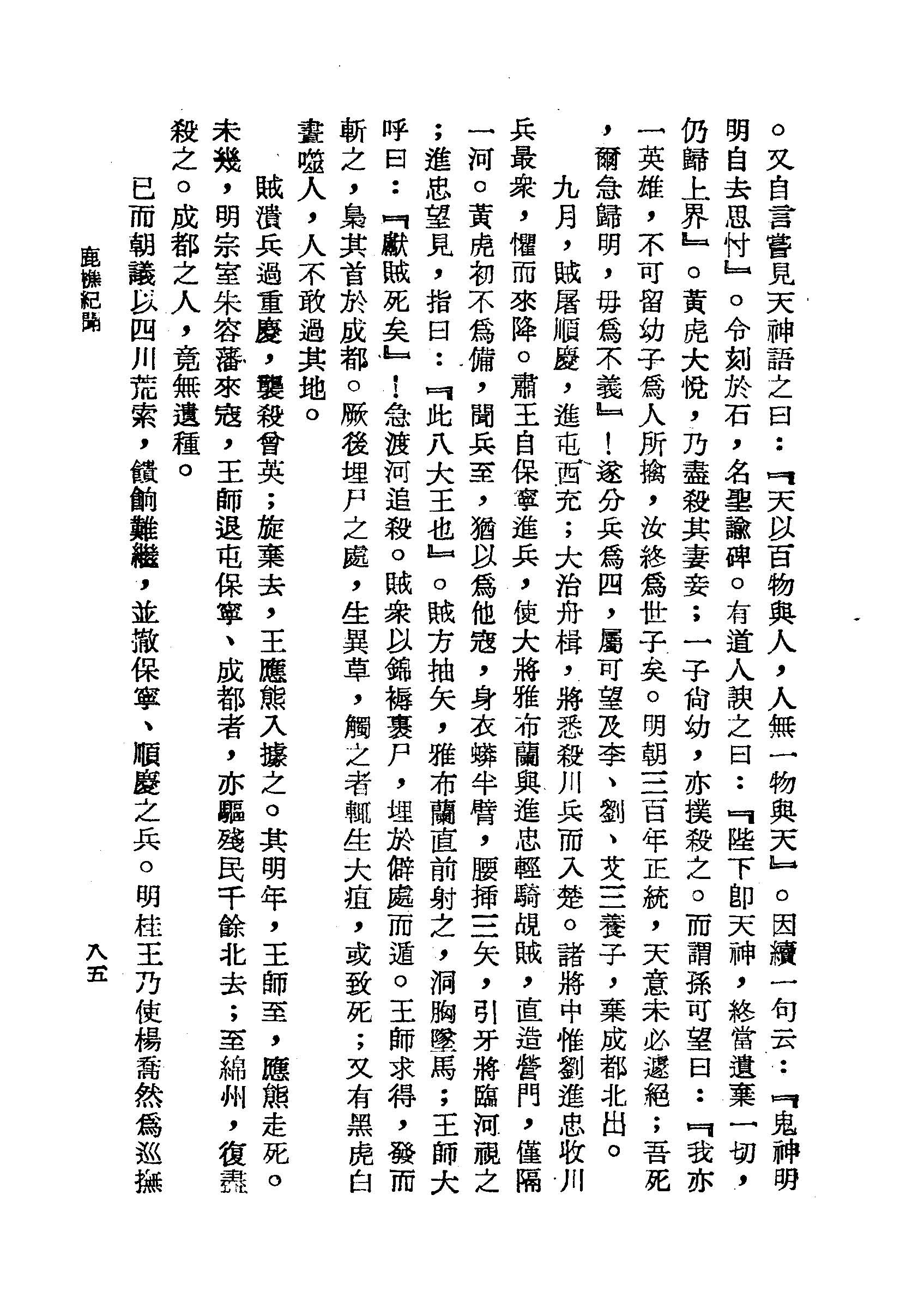 九月,賊屠順慶,進屯西充;大治舟楫,將悉殺川兵而入楚。諸將中惟劉進忠收川兵最眾,懼而來降。肅王自保寧進兵,使大將雅布蘭與進忠輕騎覘賊,直造營門,僅隔一河。黃虎初不為備,聞兵至,猶以為他寇,身衣蟒半臂,腰插三矢,引牙將臨河視之;進忠望見,指曰:『此八大王也』。賊方抽矢,雅布蘭直前射之,洞胸墜馬;王師大呼曰:『獻賊死矣』!急渡河追殺。賊眾以錦褥裹尸,埋於僻處而遁。王師求得,發而斬之,梟其首於成都。厥後埋尸之處,生異草,觸之者輒生大疽,或致死;又有黑虎白晝噬人,人不敢過其地。