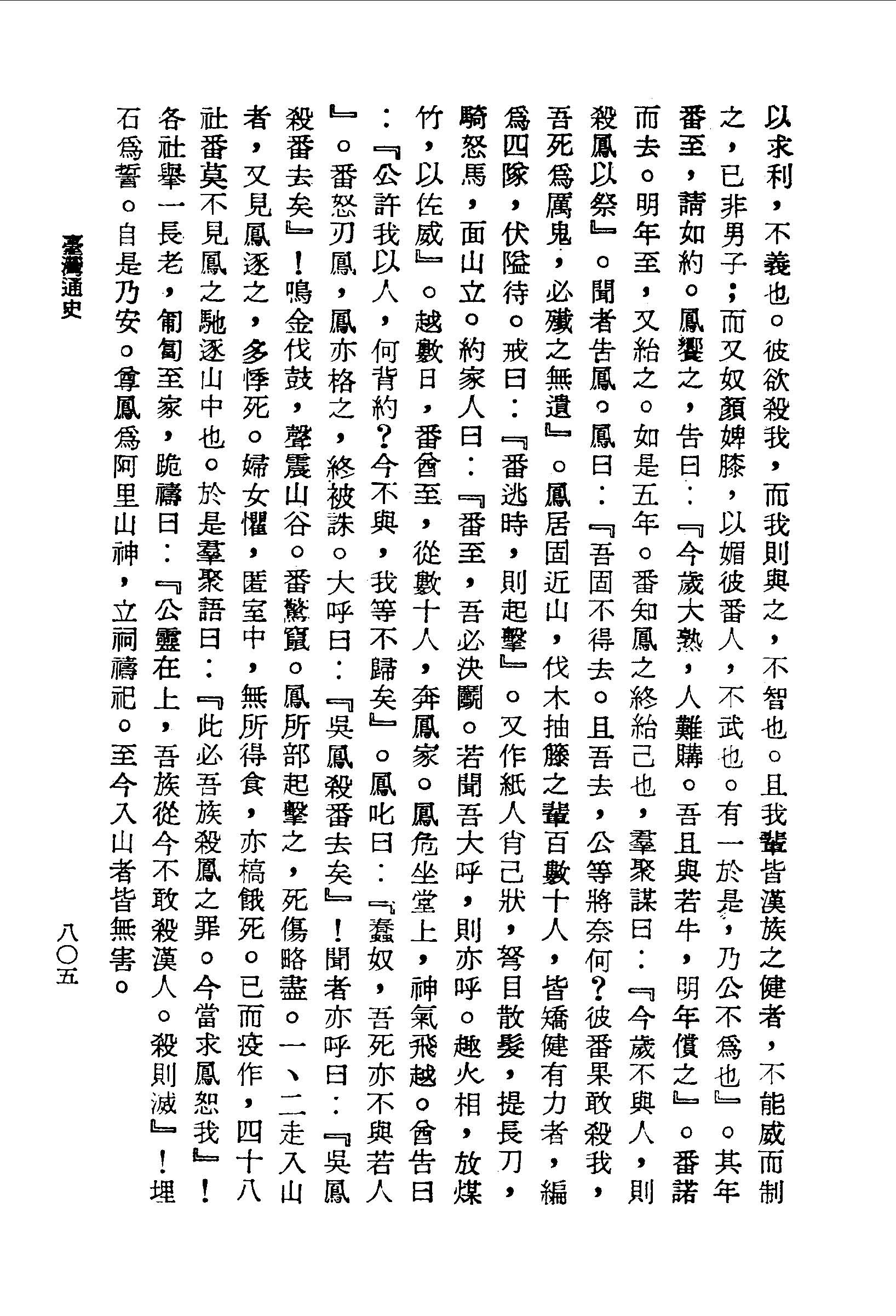 聞者亦呼曰:『吳鳳殺番去矣』!鳴金伐鼓,聲震山谷。番驚竄。鳳所部起擊之,死傷略盡。一、二走入山者,又見鳳逐之,多悸死。婦女懼,匿室中,無所得食,亦槁餓死。已而疫作,四十八社番莫不見鳳之馳逐山中也。