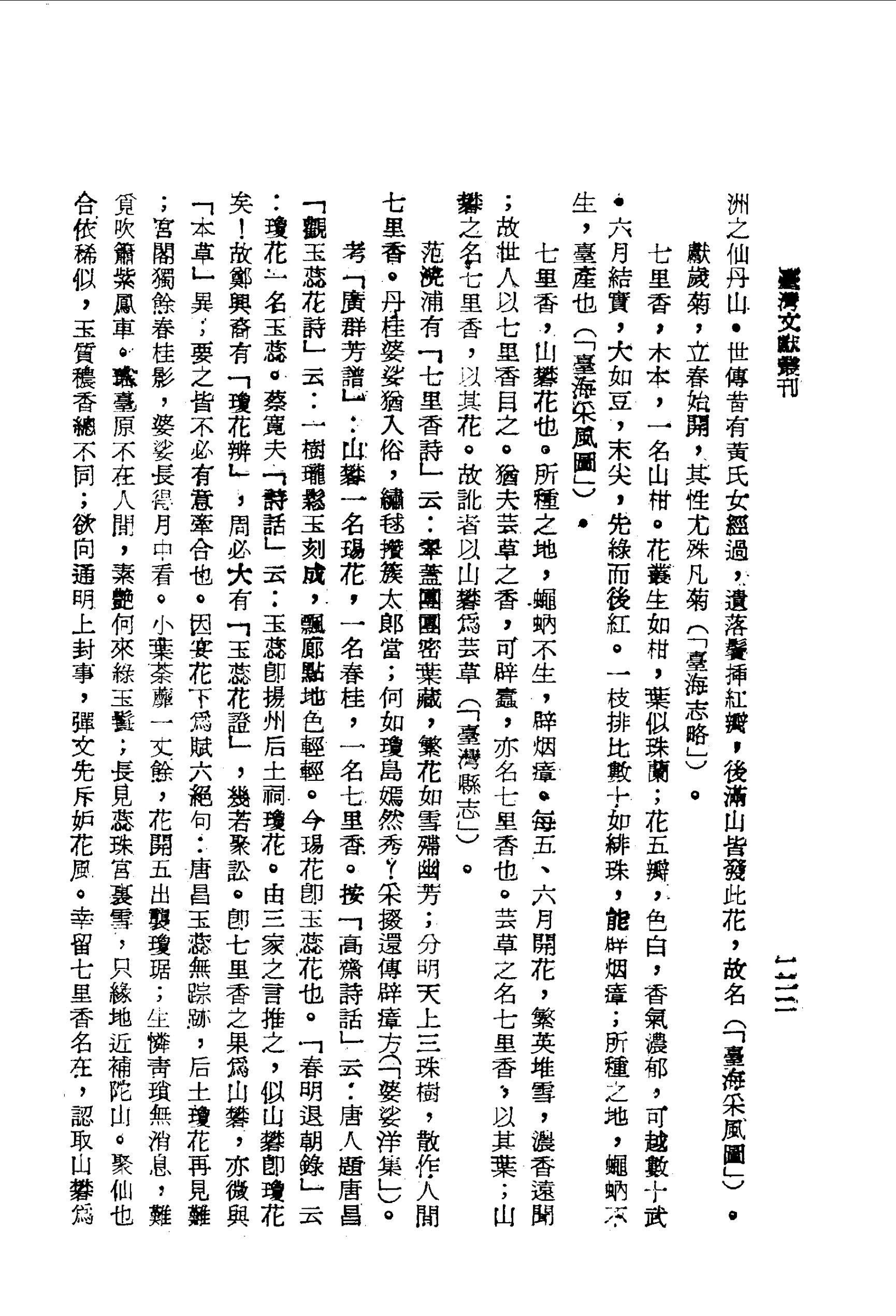 七里香,山礬花也.所種之地,蠅蚋不生,辟烟瘴.每五、六月開花,繁英堆雪,濃香遠聞;故世人以七里香目之.猶夫芸草之香,可辟蠹,亦名七里香也.芸草之名七里香,以其葉;山礬之名七里香,以其花.故訛者以山礬為芸草(「臺灣縣志」).