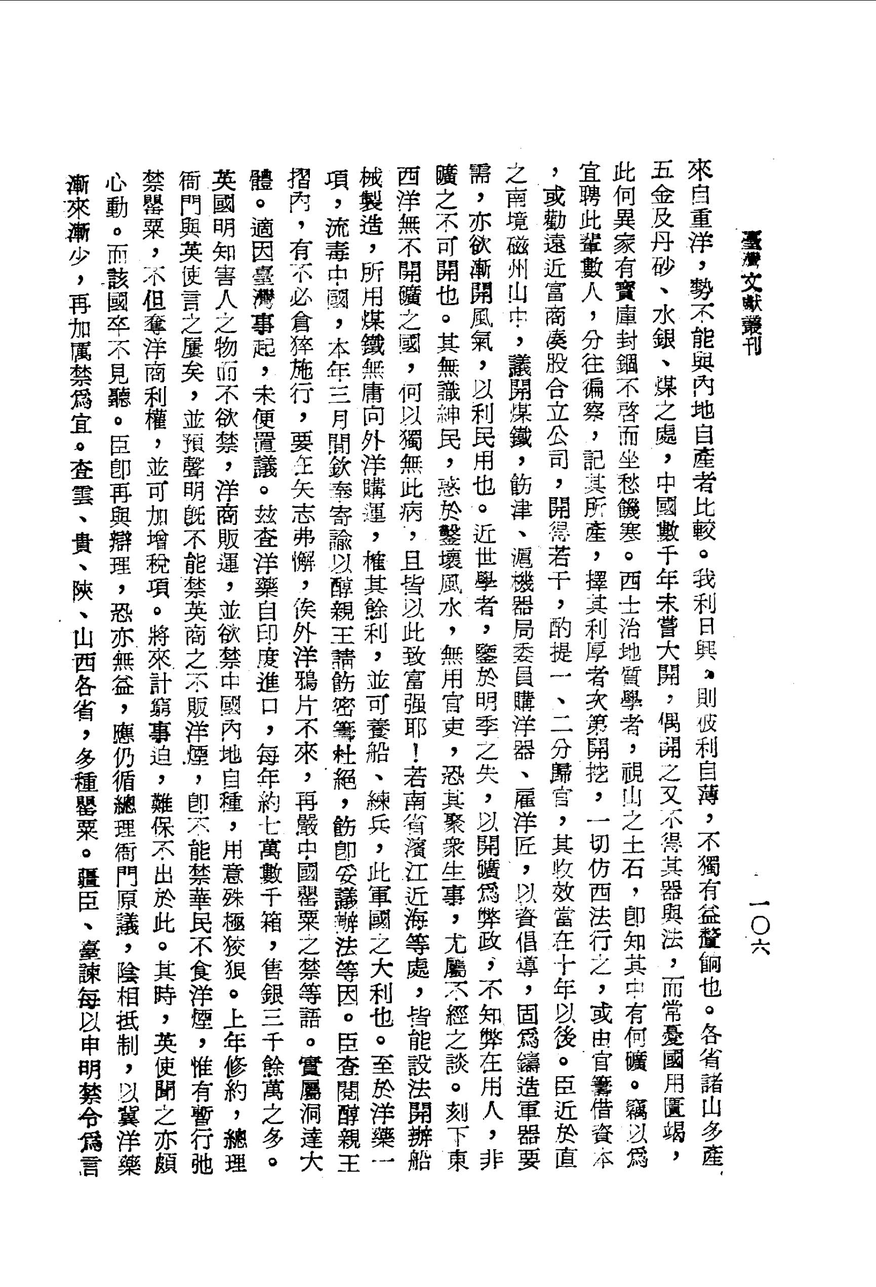 至於洋藥一項,流毒中國,本年三月間欽奉寄諭以醇親王請飭密籌杜絕,飭即妥議辦法等因。臣查閱醇親王摺內,有不必倉猝施行,要在矢志弗懈,俟外洋鴉片不來,再嚴中國罌粟之禁等語。實屬洞達大體。適因臺灣事起,未便置議。茲查洋藥自印度進口,每年約七萬數千箱,售銀三千餘萬之多。英國明知害人之物而不欲禁,洋商販運,並欲禁中國內地自種,用意殊極狡狠。上年修約,總理衙門與英使言之屢矣,並預聲明既不能禁英商之不販洋煙,即不能禁華民不食洋煙,惟有暫行弛禁罌粟,不但奪洋商利權,並可加增稅項。將來計窮事迫,難保不出於此。其時,英使聞之亦頗心動。而該國卒不見聽。臣即再與辯理,恐亦無益,應仍循總理衙門原議,陰相抵制,以冀洋藥漸來漸少,再加厲禁為宜。查雲、貴、陝、山西各省,多種罌粟。疆臣、臺諫每以申明禁令為言,是徒為外洋利藪之敺,授吏胥擾索之柄,究之罌粟日種日廣,勢仍不可遽禁。