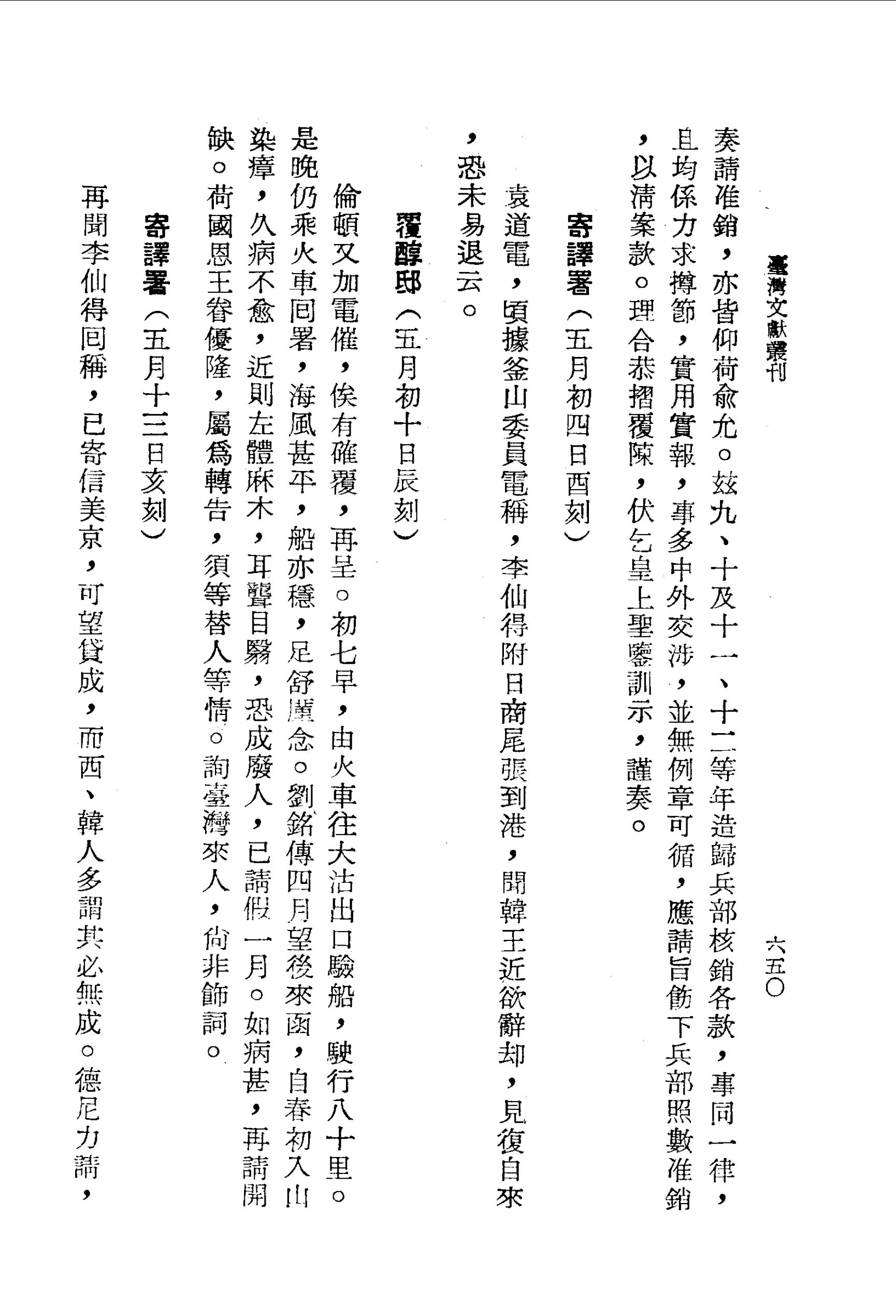 劉銘傳四月望後來函,自春初入山染瘴,久病不愈,近則左體麻木,耳聾目翳,恐成廢人,已請假一月。