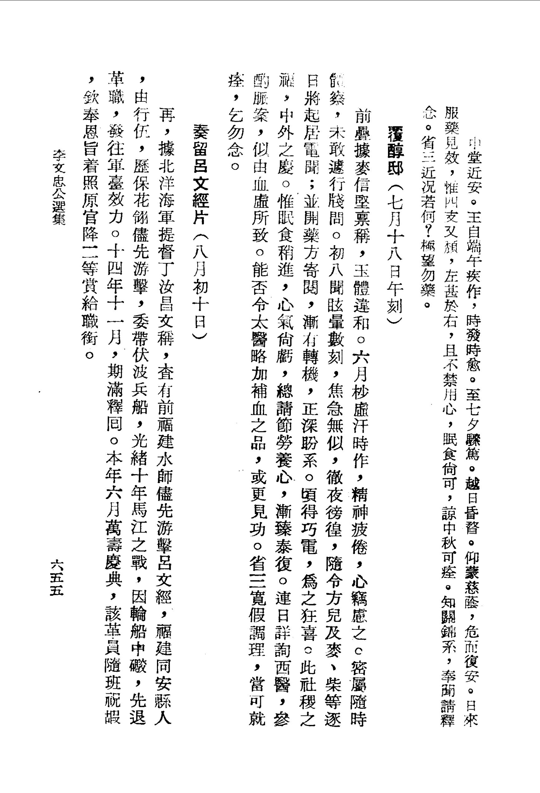 王自端午疾作,時發時愈。至七夕驟篤。越日昏瞀。仰蒙慈蔭,危而復安。日來服藥見效,惟四支又頹,左甚於右,且不禁用心,眠食尚可,諒中秋可痊。