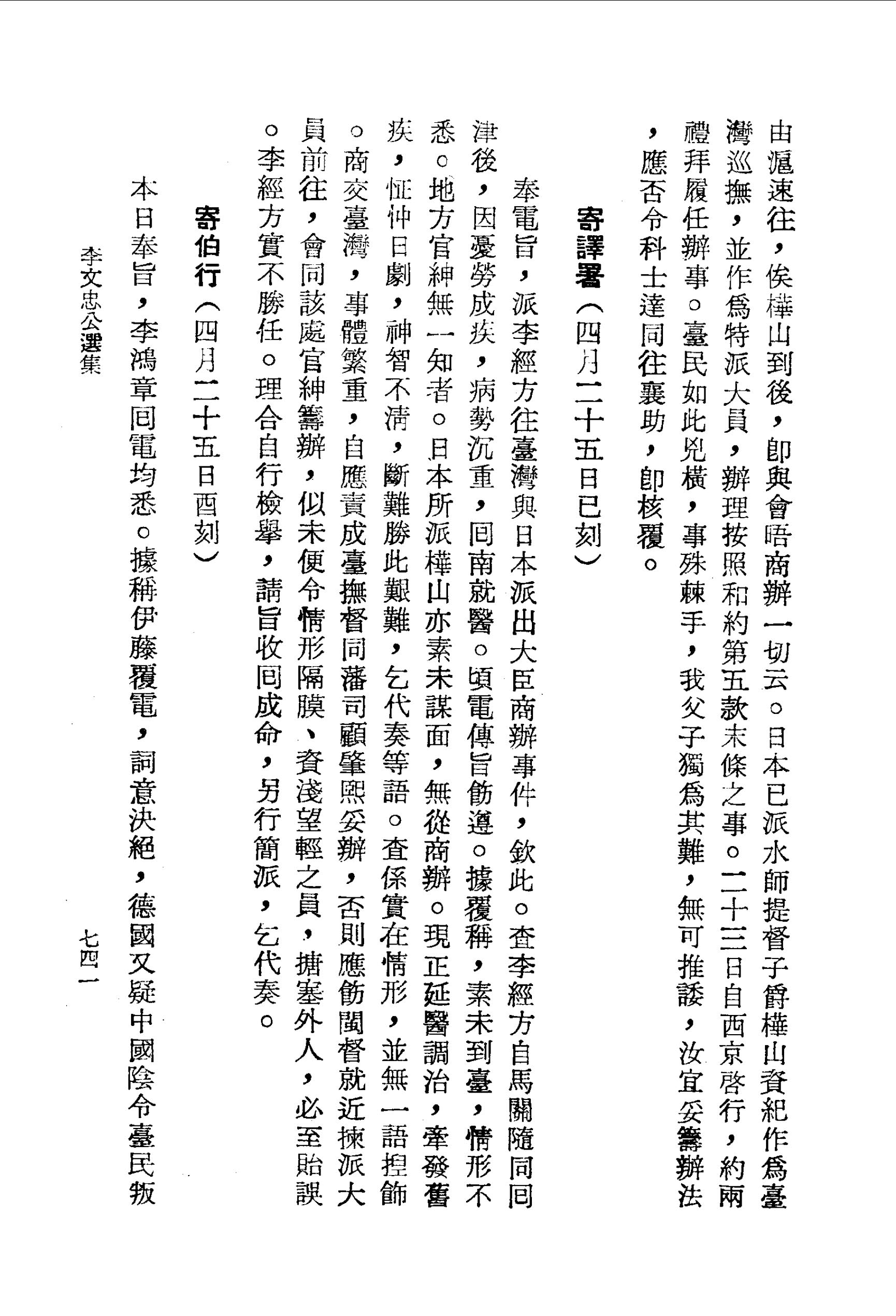 查李經方自馬關隨同回津後,因憂勞成疾,病勢沉重,回南就醫。頃電傳旨飭遵。據覆稱,素未到臺,情形不悉。地方官紳無一知者。日本所派樺山亦素未謀面,無從商辦。現正延醫調治,牽發舊疾,怔忡日劇,神智不清,斷難勝此艱難,乞代奏等語。查係實在情形,並無一語捏飾。