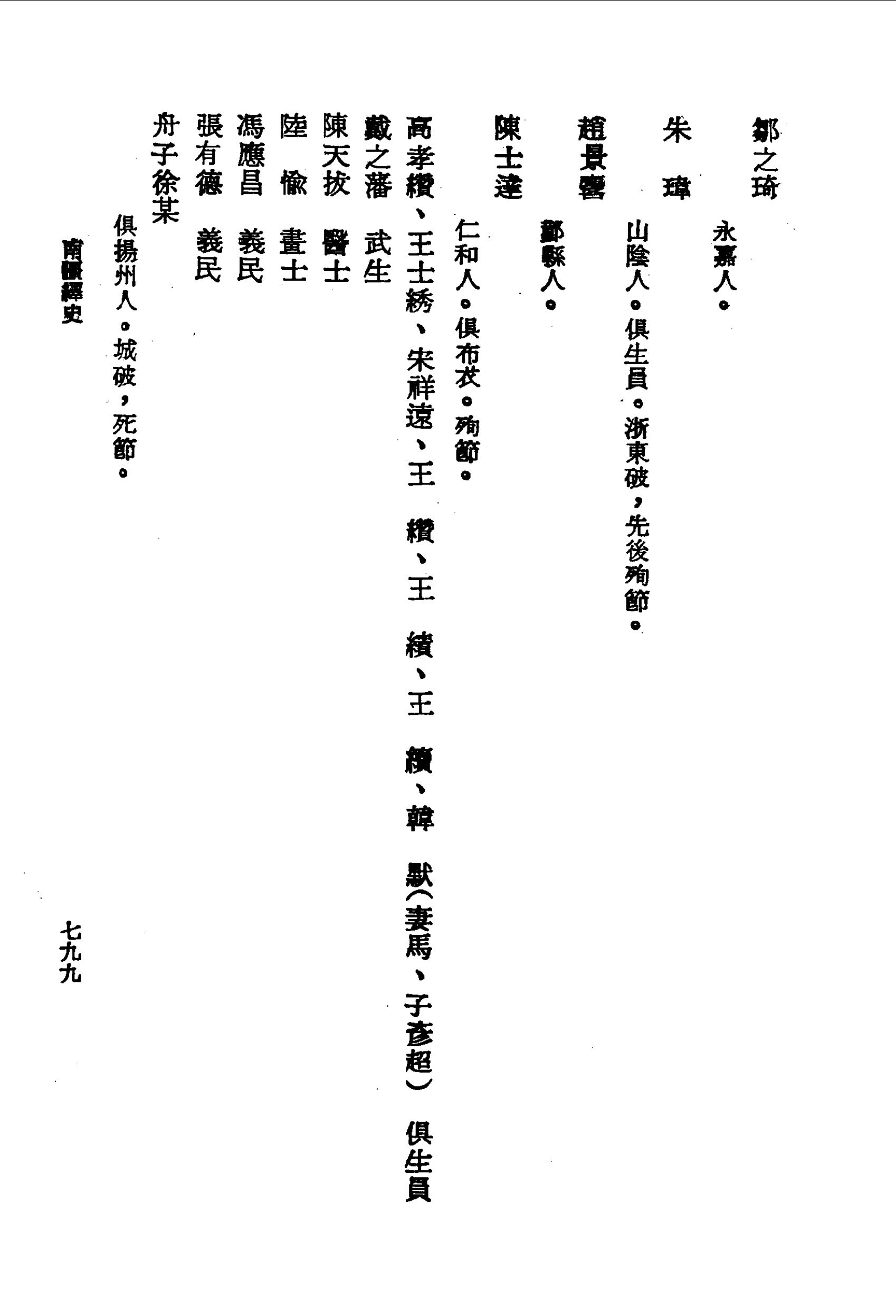 高孝纘、王士綉、宋祥遠、王纘、王績、王續、韓默(妻馬、子彥超) 俱生員戴之藩 武生陳天拔 醫士陸愉 畫士馮應昌 義民張有德 義民舟子徐某 俱揚州人。城破,死節。