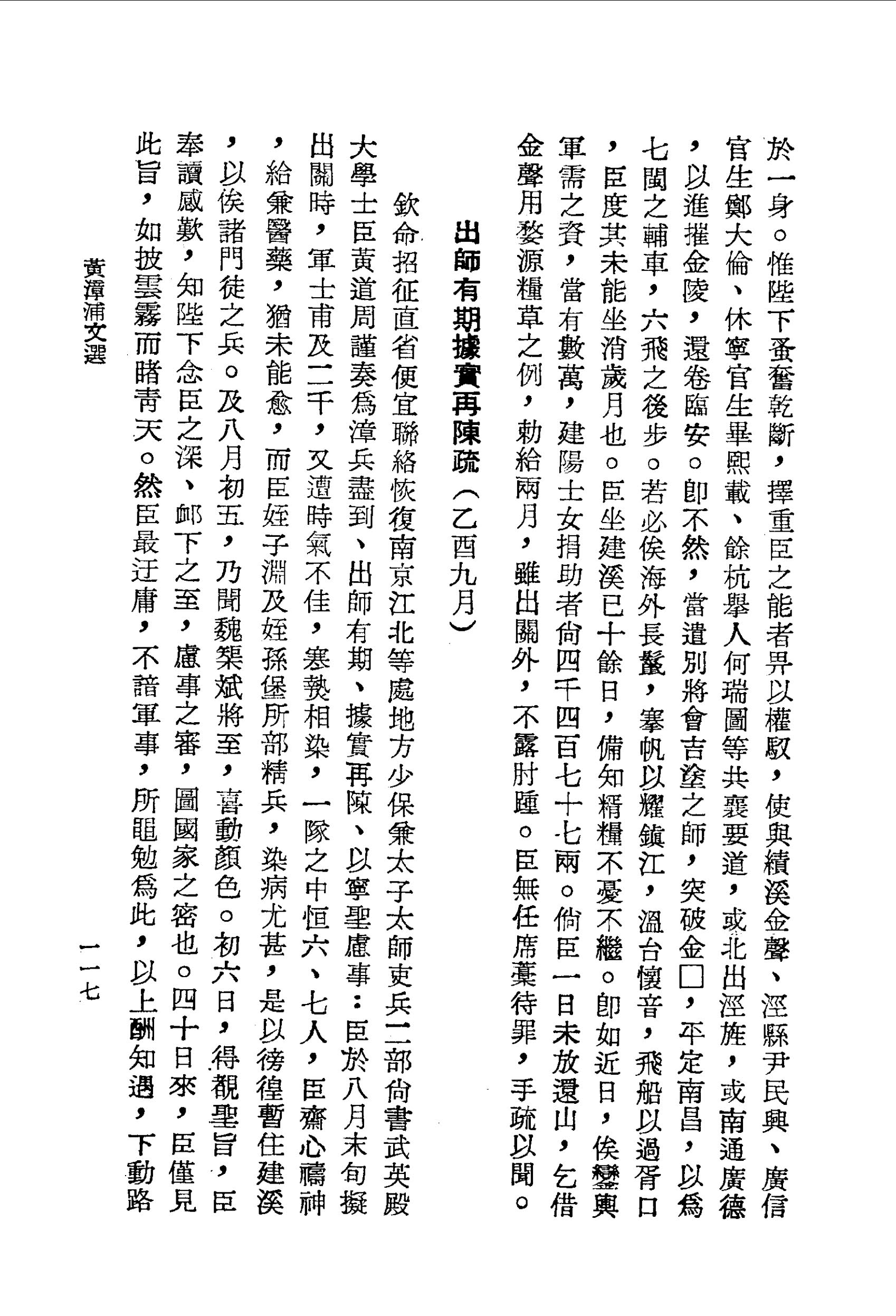 欽命招征直省便宜聯絡恢復南京江北等處地方少保兼太子太師吏兵二部尚書武英殿大學士臣黃道周謹奏為漳兵盡到、出師有期、據實再陳、以寧聖慮事:臣於八月末旬擬出關時,軍士甫及二千,又遭時氣不佳,寒熱相染,一隊之中恒六、七人,臣齋心禱神,給兼醫藥,猶未能愈,而臣姪子淵及姪孫堡所部精兵,染病尤甚,是以徬徨暫住建溪,以俟諸門徒之兵。