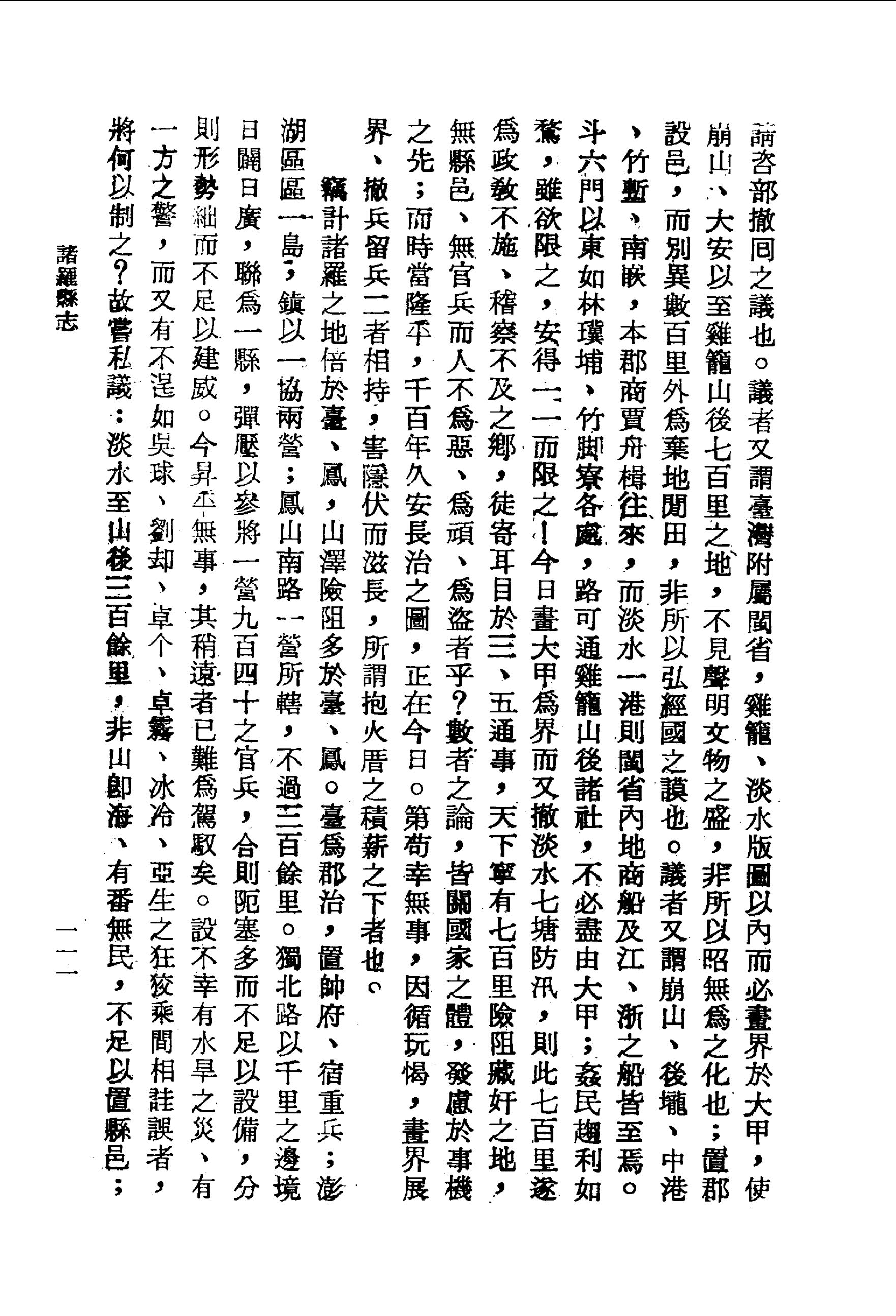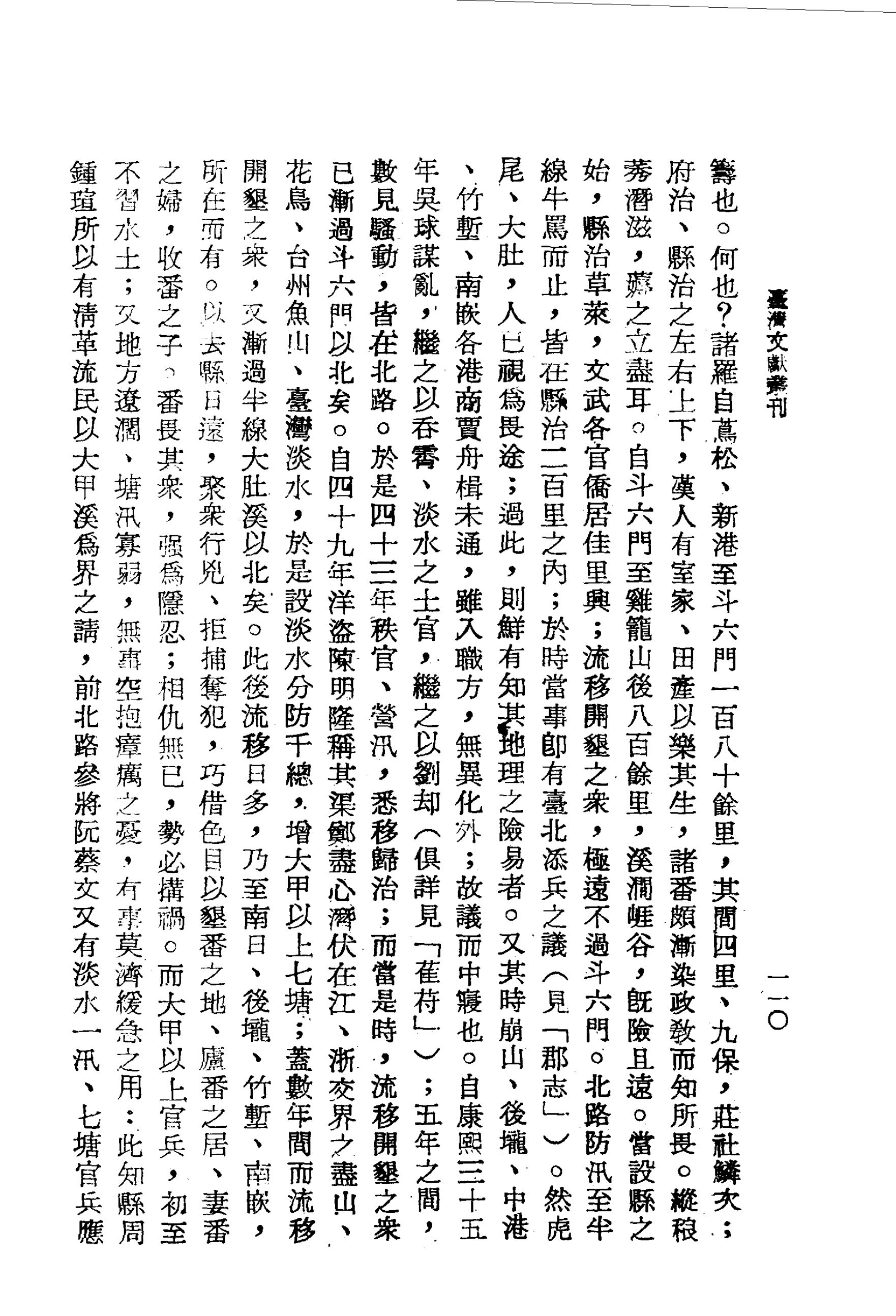 而大甲以上官兵,初至不習水土;又地方遼闊、塘汛寡弱,無事空抱瘴癘之憂,有事莫濟緩急之用:此知縣周鍾瑄所以有清革流民以大甲溪為界之請,前北路參將阮蔡文又有淡水一汛、七塘官兵應請咨部撤回之議也.