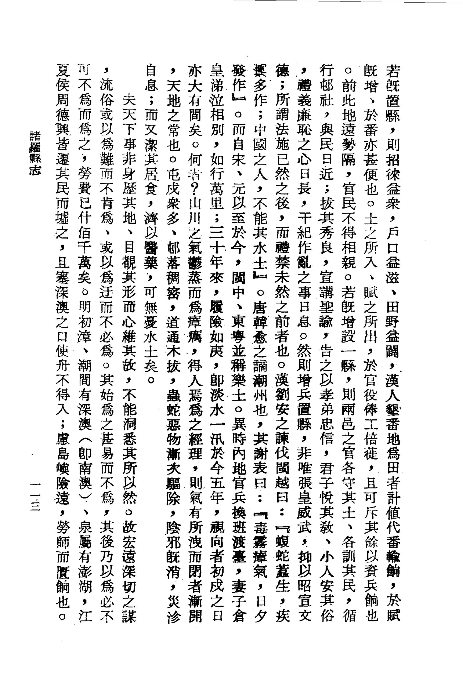 漢劉安之諫伐閩越曰:『蝮蛇蠚生,疾癘多作;中國之人,不能其水土』.唐韓愈之謫潮州也,其謝表曰:『毒霧瘴氣,日夕發作』.而自宋、元以至於今,閩中、東粵並稱樂土.異時內地官兵換班渡臺,妻子倉皇涕泣相別,如行萬里;三十年來,履險如夷,即淡水一汛於今五年,視向者初戍之日亦大有間矣.何者?山川之氣鬱蒸而為瘴癘,得人焉為之經理,則氣有所洩而閉者漸開,天地之常也.屯戍眾多、邨落稠密,道通木拔,蟲蛇惡物漸次驅除,陰邪既消,災沴自息;而又潔其居食,濟以醫藥,可無憂水土矣.