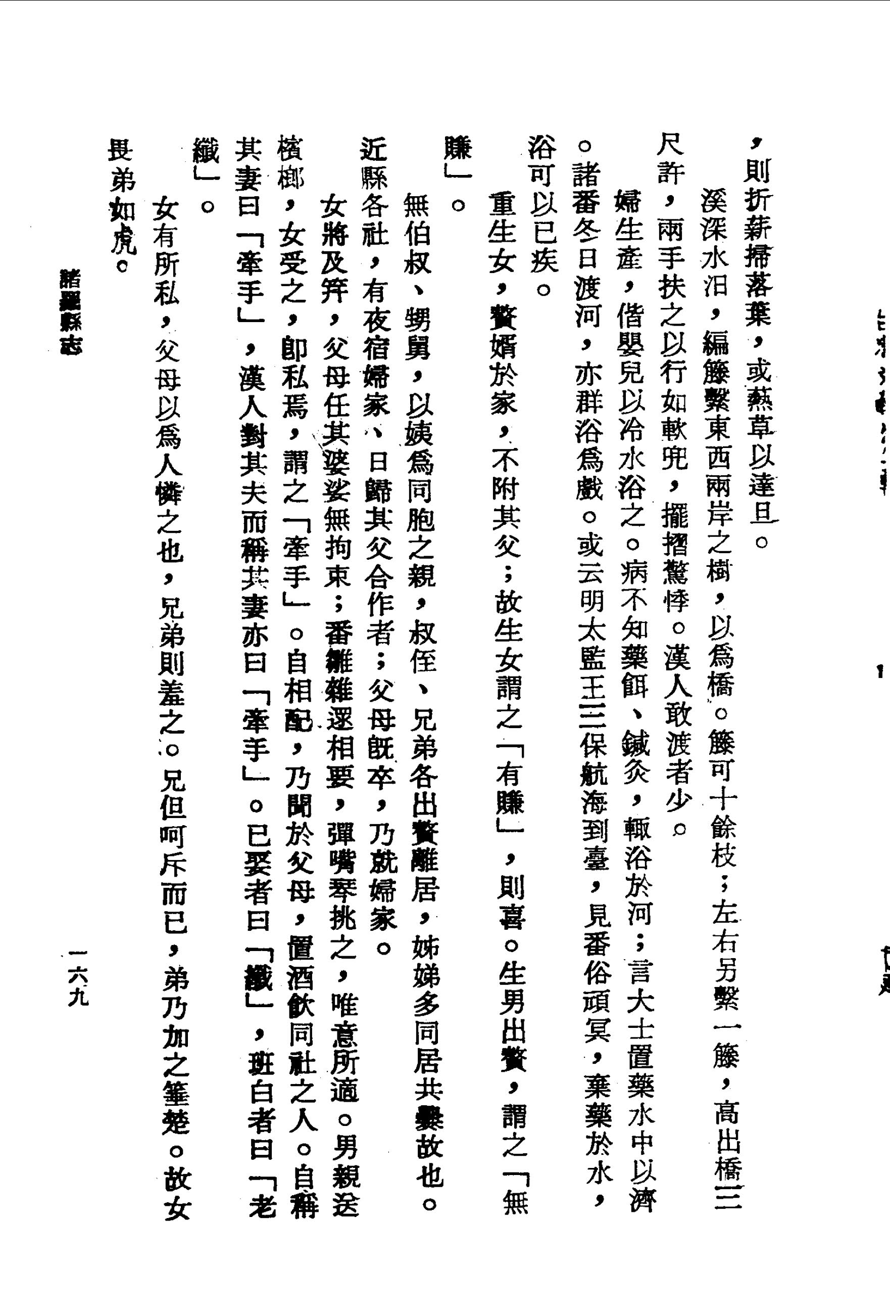 婦生產,偕嬰兒以冷水浴之.病不知藥餌、鍼灸,輒浴於河;言大士置藥水中以濟.諸番冬日渡河,亦群浴為戲.或云明太監王三保航海到臺,見番俗頑冥,棄藥於水,浴可以已疾.