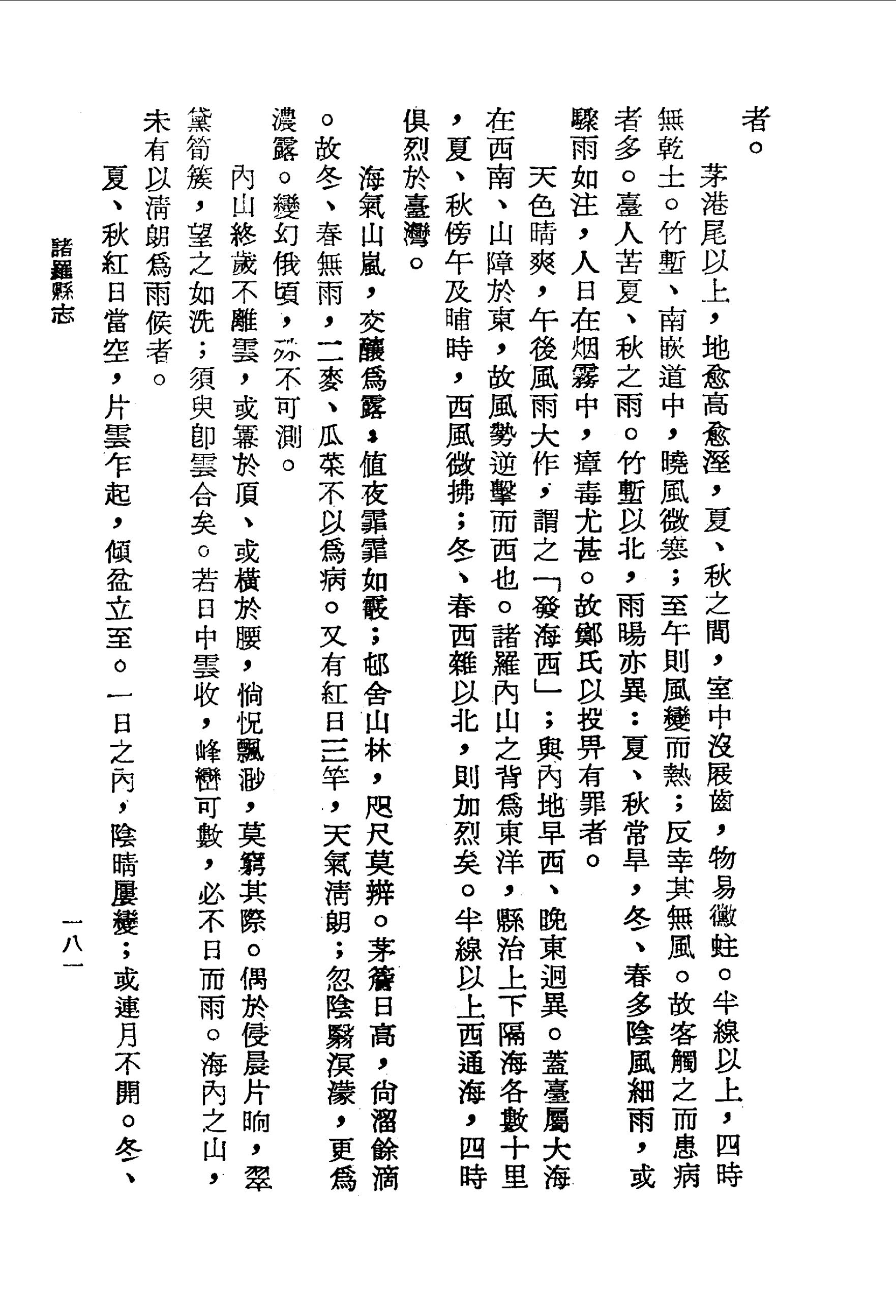 茅港尾以上,地愈高愈溼,夏、秋之間,室中沒屐齒,物易黴蛀.半線以上,四時無乾土.竹塹、南嵌道中,曉風微寒;至午則風變而熱;反幸其無風.故客觸之而患病者多.臺人苦夏、秋之雨.竹塹以北,雨暘亦異:夏、秋常旱,冬、春多陰風細雨,或驟雨如注,人日在烟霧中,瘴毒尤甚.故鄭氏以投畀有罪者.