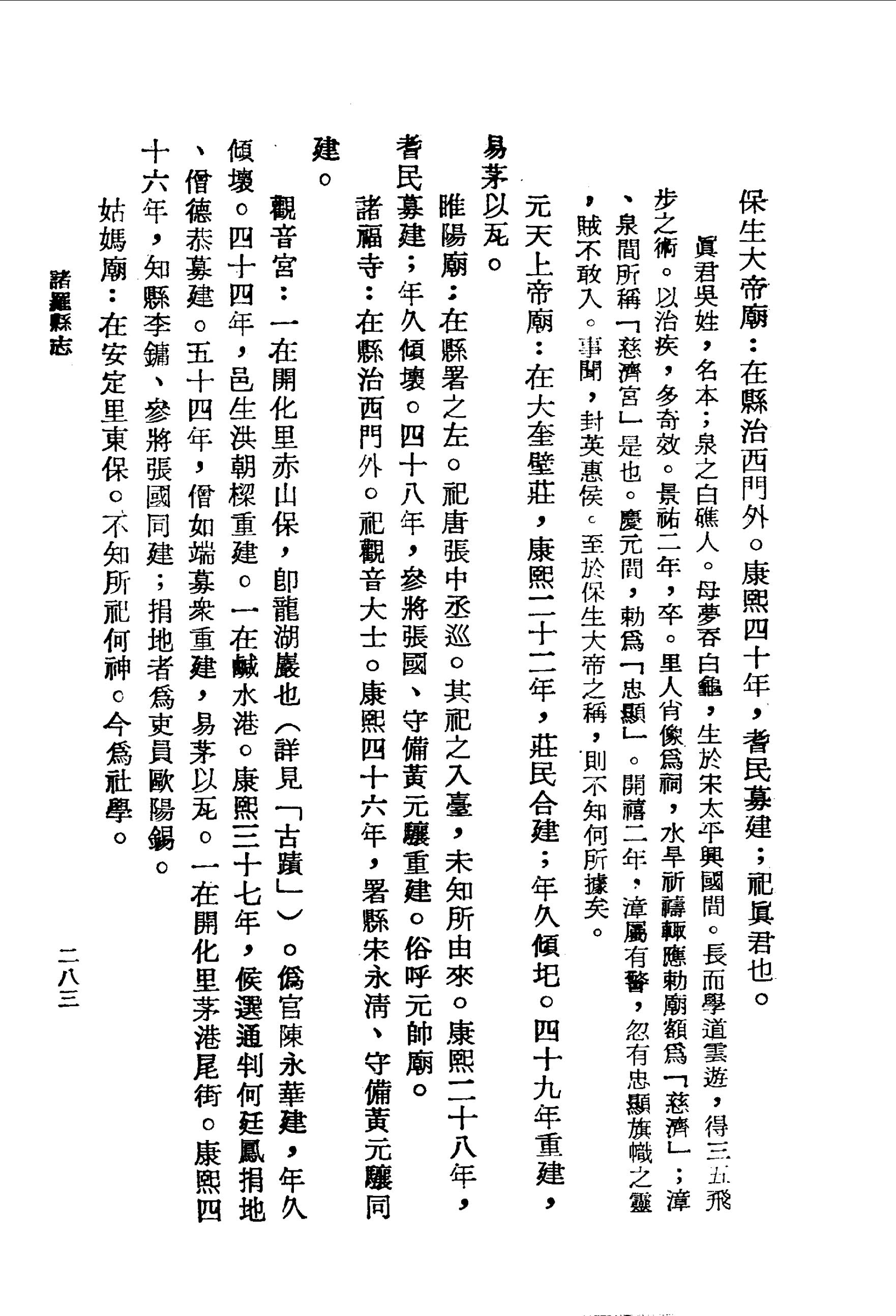 真君吳姓,名本;泉之白礁人.母夢吞白龜,生於宋太平興國間.長而學道雲遊,得三五飛步之術.以治疾,多奇效.景祐二年,卒.里人肖像為祠,水旱祈禱輒應敕廟額為「慈濟」;漳、泉間所稱「慈濟宮」是也.慶元間,敕為「忠顯」.開禧二年,漳屬有警,忽有忠顯旗幟之靈,賊不敢入.事聞,封英惠侯.至於保生大帝之稱,則不知何所據矣.